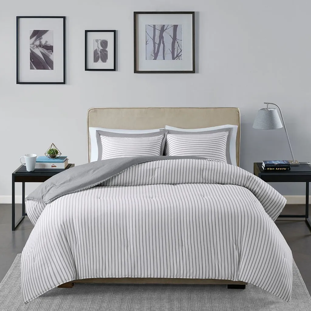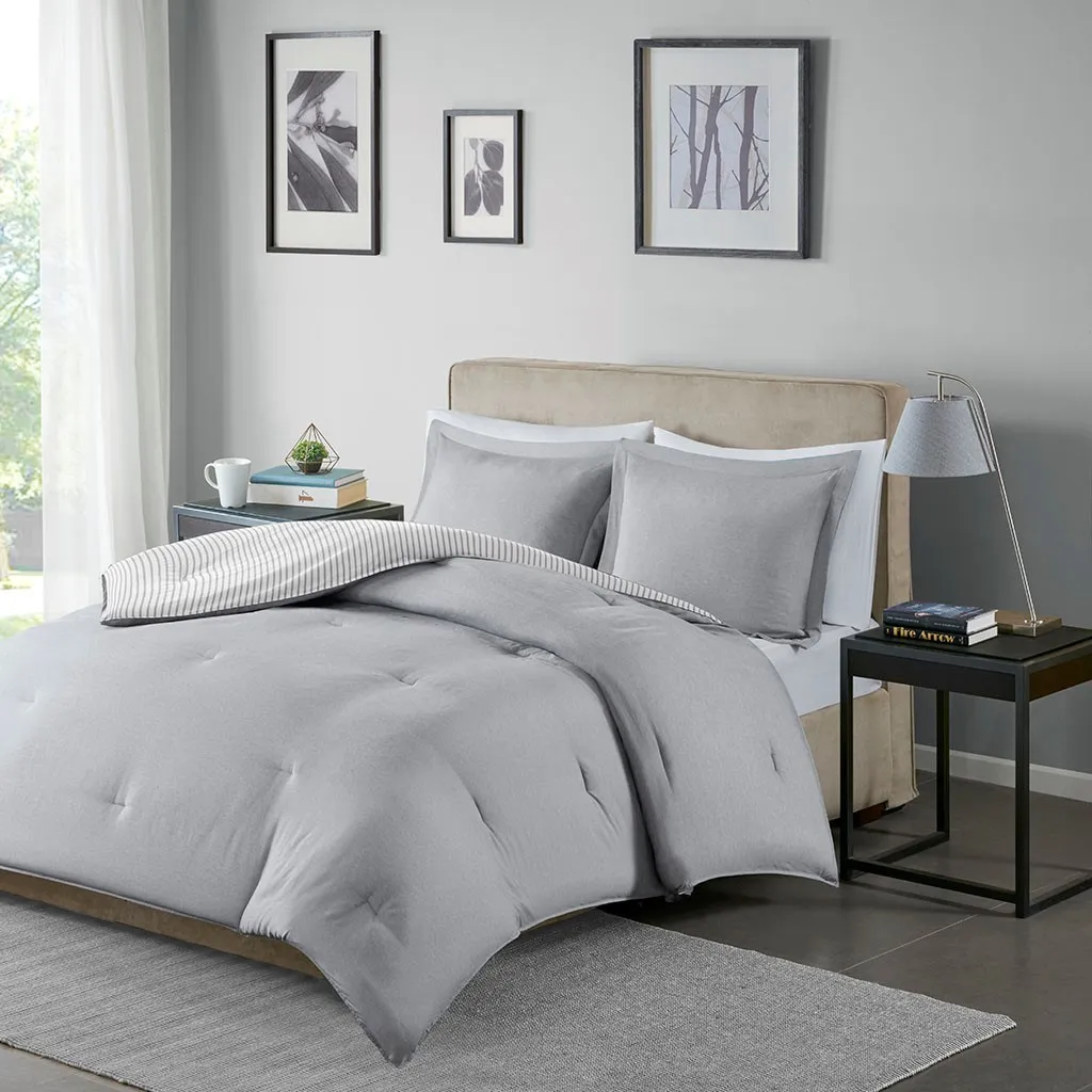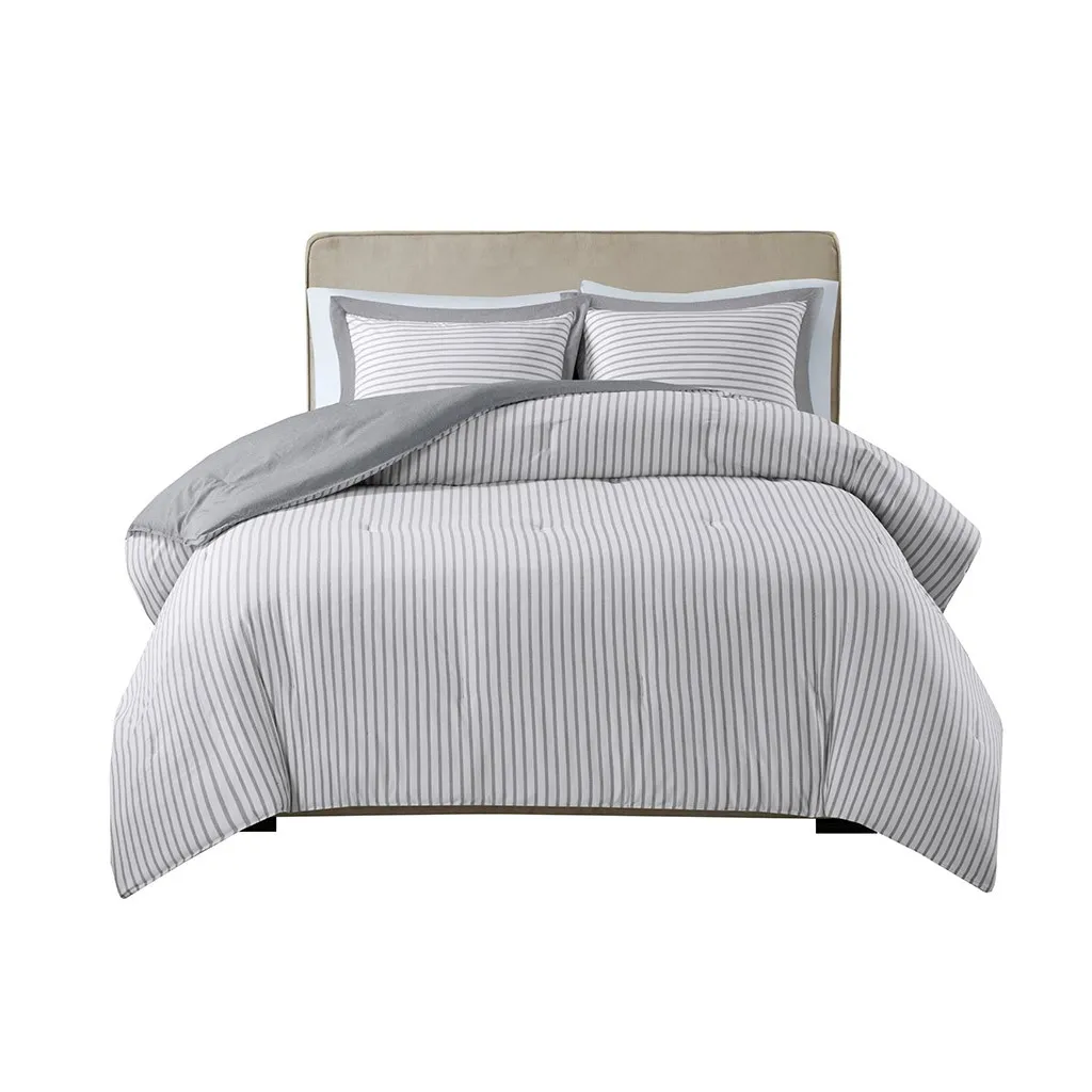 The Madison Park Essentials Hayden Reversible Down Alternative Comforter Mini Set gives your bedroom a fresh casual update. Sporting a grey striped pattern, the comforter and shams reverse to a solid grey allowing you to mix and match styles for the perfect look. Machine washable, this reversible comforter is made from ultra-soft yarn dyed fabric that is sure to keep you warm all year round.