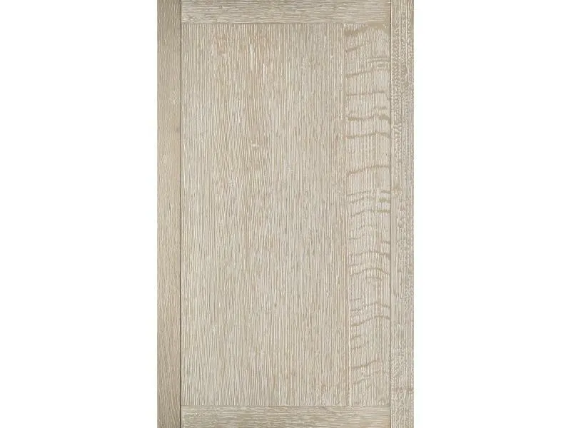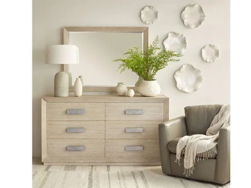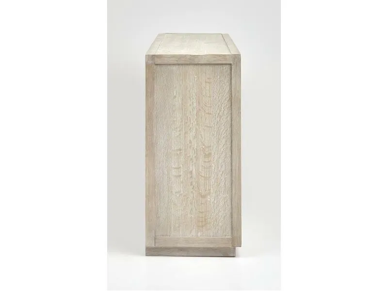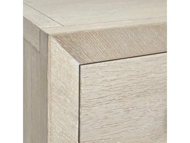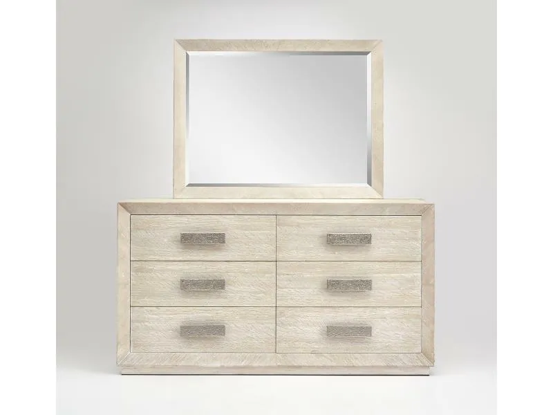 Both rustic and modern are adjectives that were used as we created these pieces. Clean lined cases with beveled, box mitered picture frame details are veneered with a herringbone pattern surrounding each bank of drawers to create subtle detail. Plinth bases are recessed to create a floating effect, rounding out the contemporary lines. This group is veneered with extra thick cut, cathedral White Oak with flake for a natural organic vibe. The finish employs significant hand ageing including wirebrushing, rocking, rasp and gouging to create the desired rustic effect. The upholstered beds feature Culp's Omari fabric. Constructed with an offset basket weave, this fabric consists of a polyester, rayon, and linen yarn blend. The plied slub yarns are used in both the warp and weft direction to create a subtle color contrast and add overall texture.