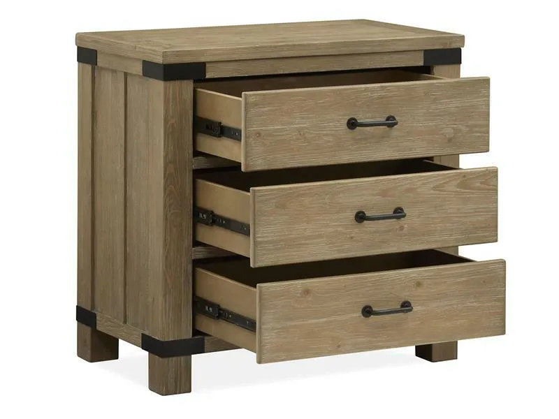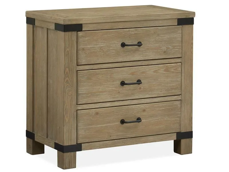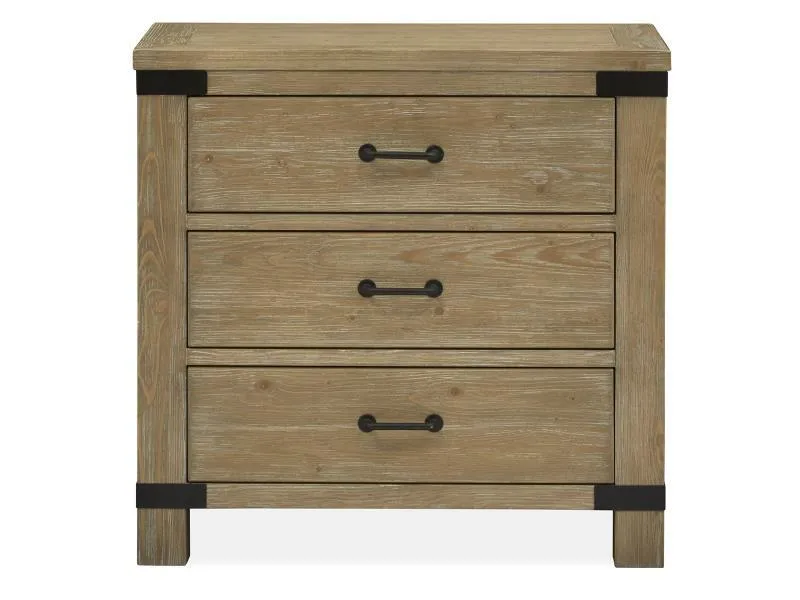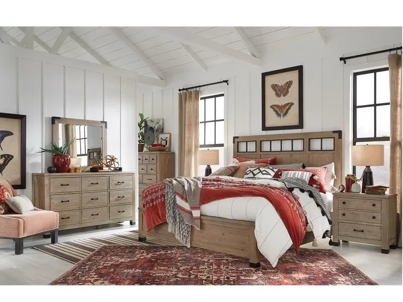 Evoke the ambience of a classic farmhouse or a reclaimed factory loft with the Madison Heights Collection. The board-and-batten construction of the signature panel bed is inspired by architectural details from 19th and 20th Century farmhouses, and window-pane motifs in textured glass on key pieces bring to mind the black metal windows found in country farmhouses or in urban reclaimed factories. Black metal ferrules, corner brackets and forged iron hardware bring an industrial modern vibe to the craftsmen-like silhouettes. A black metal bed and a black mirror with window-pane border provide a dramatic contrast to the Weathered Fawn wire-brushed and distressed finish over solid Pine for an authentic and casual feel. Whether you aspire to loft living or country living, the Madison Heights Collection will bring your dream home to life.