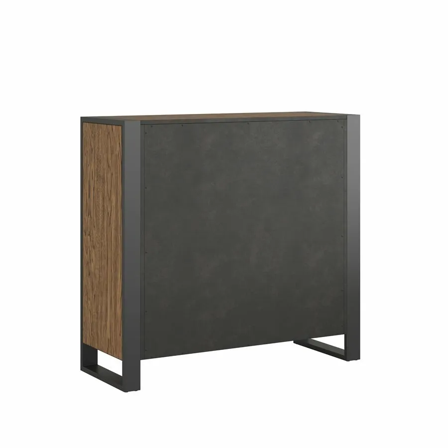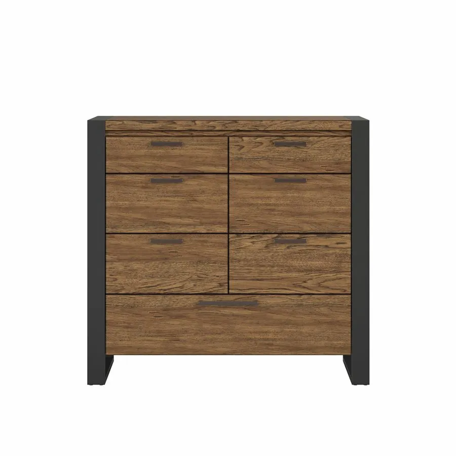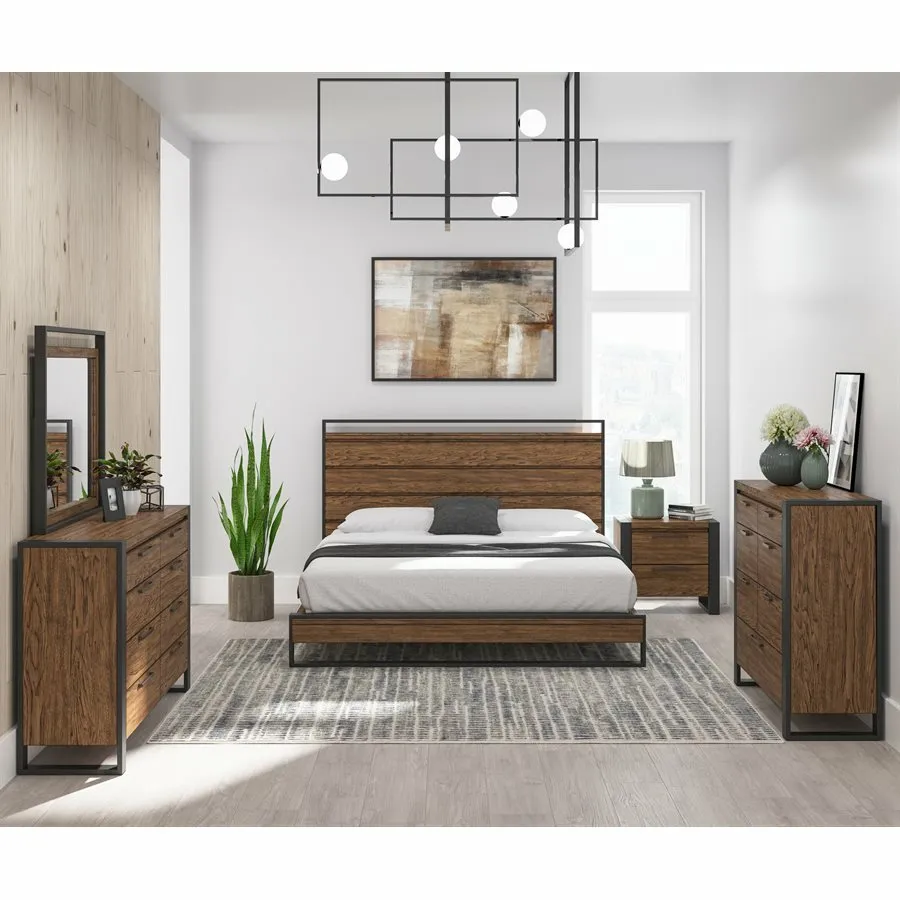 The Hendrick collection provides a simple, industrial feel with a modern touch that can coordinate with just about any style. The rectangular silhouettes of the case pieces and wide planking of the headboard are edged in dark trim calling to mind exposed structural elements. This creates a textural interaction between the framework and the hickory wood veneer whose natural color variations and characteristics are accentuated by the rich, mid-tone brown finish. Long bar hardware underscores the clean, straight lines of the collection. Whether you dress it up for a more urban vibe or dress it down to embrace the industrial and rustic, the Hendrick bedroom will add just the right amount of charm to your space.