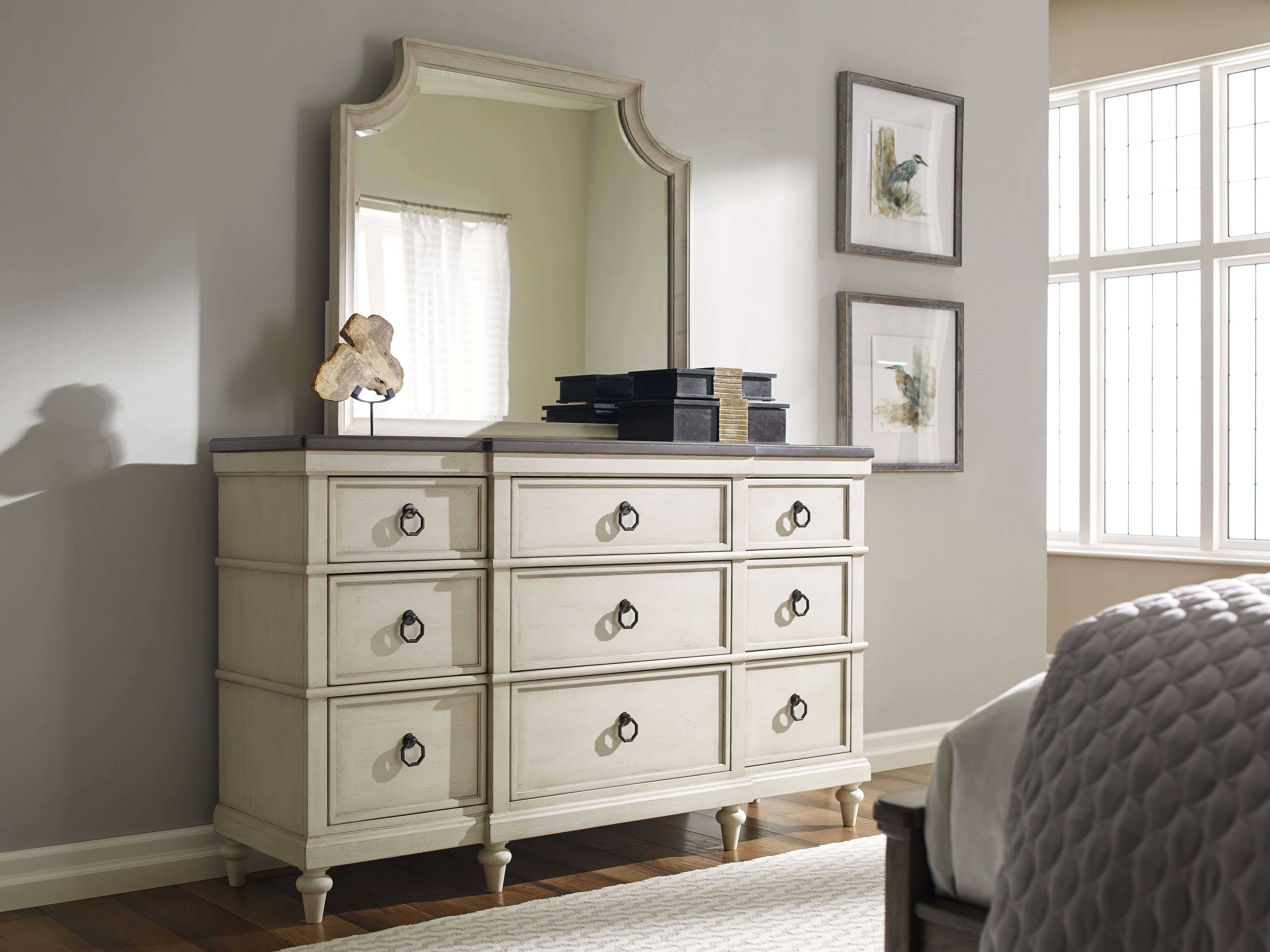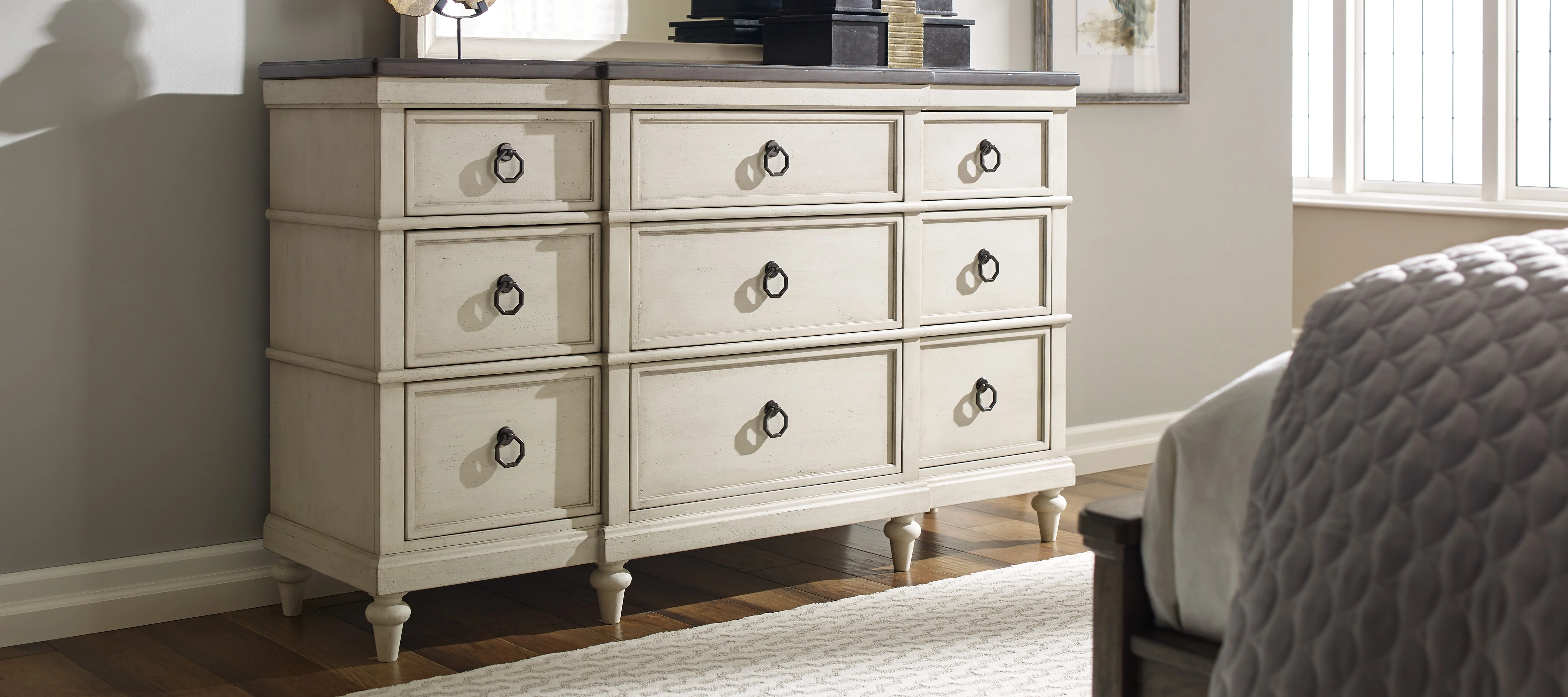 The Brookhaven dresser features 9 drawers with a jewelry tray in the top right drawer. The bottom drawers are cedar lined to protect your woolens, cashmere, and silks. With a cozy, updated farmhouse look, Brookhaven is an inviting collection that will feel at home in multiple settings. The painted, Vintage Linen finish and Rustic Dark Elm finished tops complement each other and add to the comfortable appeal of this piece. Custom hexagon ring pulls and knobs in a dark, Oiled Bronze finish complete the look. Crafted of Poplar solids and Flat Cut Elm Veneers.