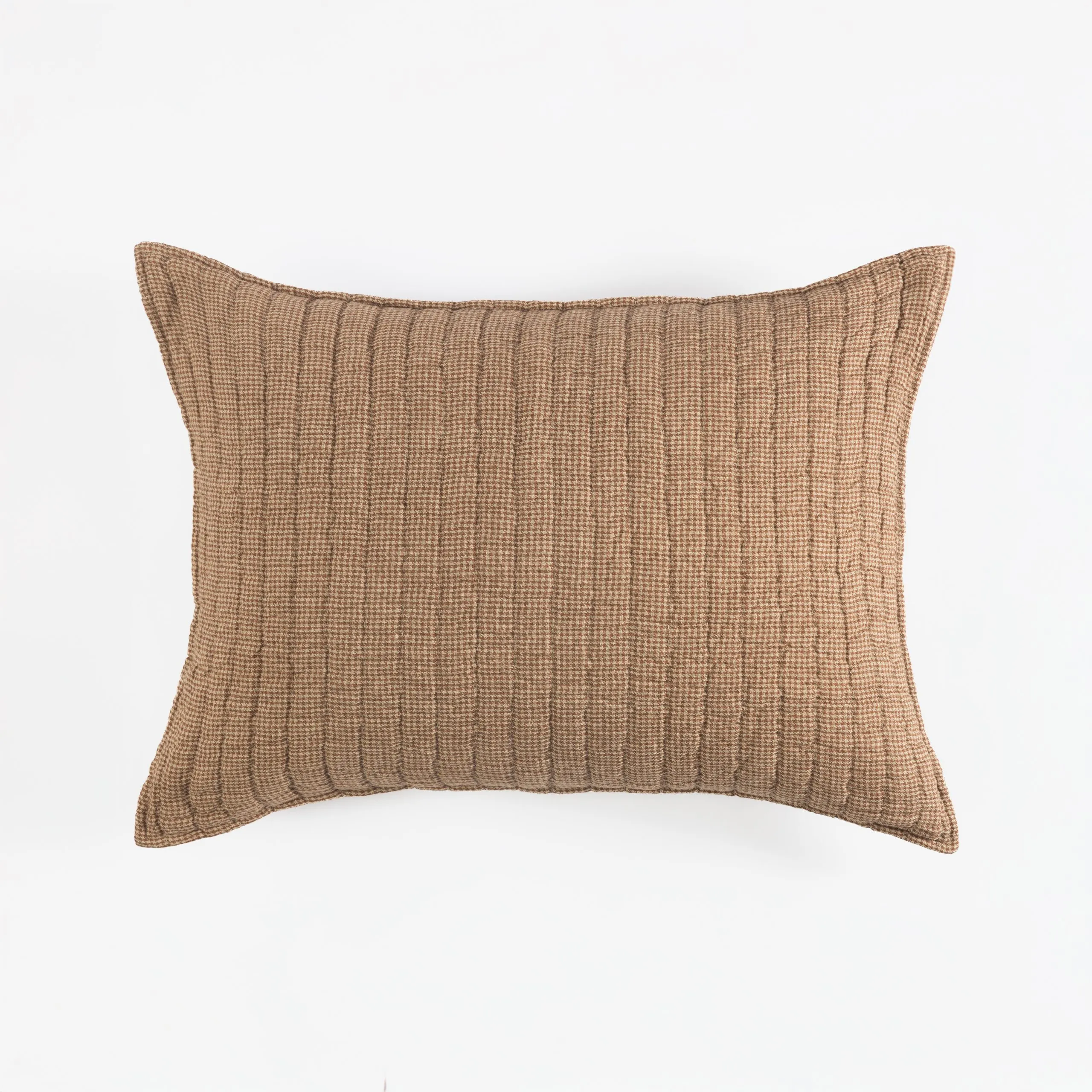 Woven in a refined houndstooth pattern, this saddle brown quilt blends timeless design with tactile richness. Yarn-dyed cotton threads in warm saddle brown and neutral oatmeal create subtle contrast and enduring depth, while the hand-quilted finish lends artisanal character. Filled with breathable cotton batting, this quilt offers lightweight warmth and a tailored, inviting presence—perfect for grounding layered looks with understated sophistication.