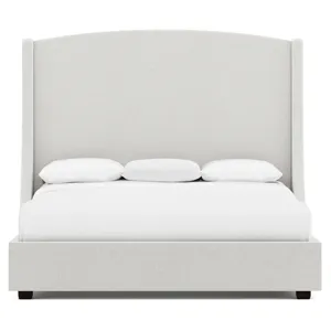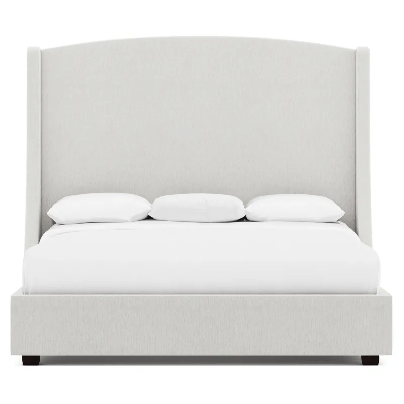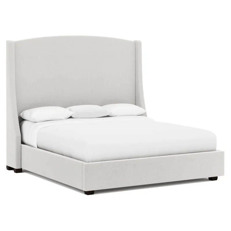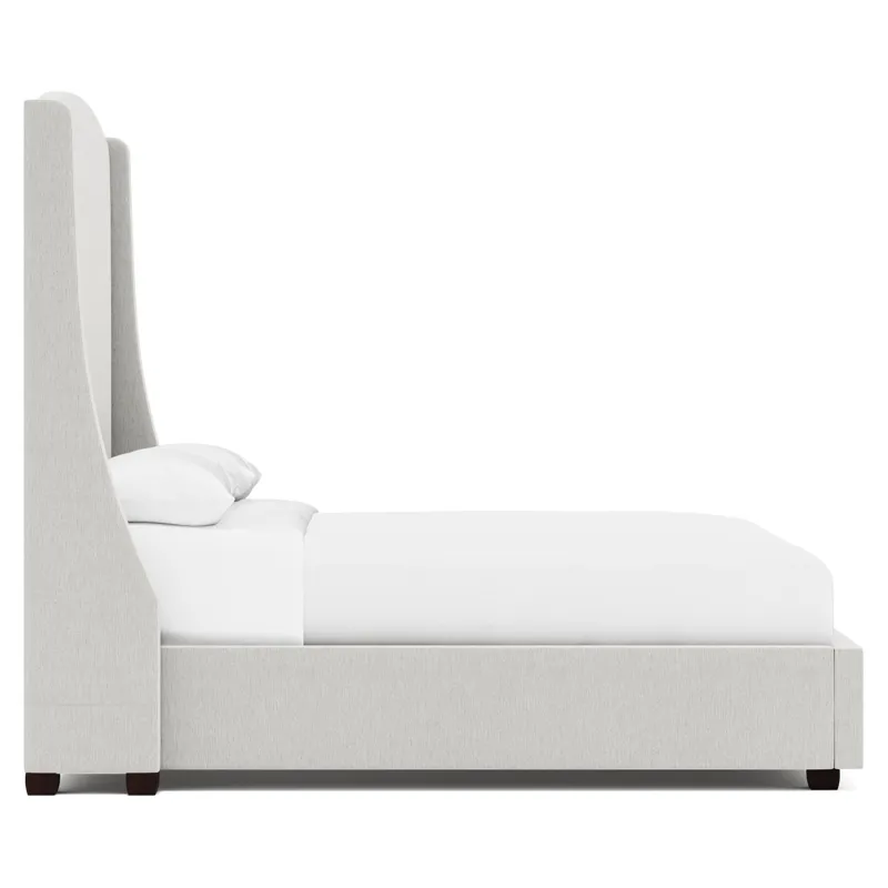Fully upholstered headboard with "wings". Nail head trim on outside of "wings" and along top rail. Select nailhead from available options. (NOTE: Can order headboard without nail trim, but cannot add welt option.) Feet in Smoke (A01) or Espresso (E01) finish. Vandalay slat system. Note: Headboard cannot be used alone. Must be ordered with footboard and side rails.
