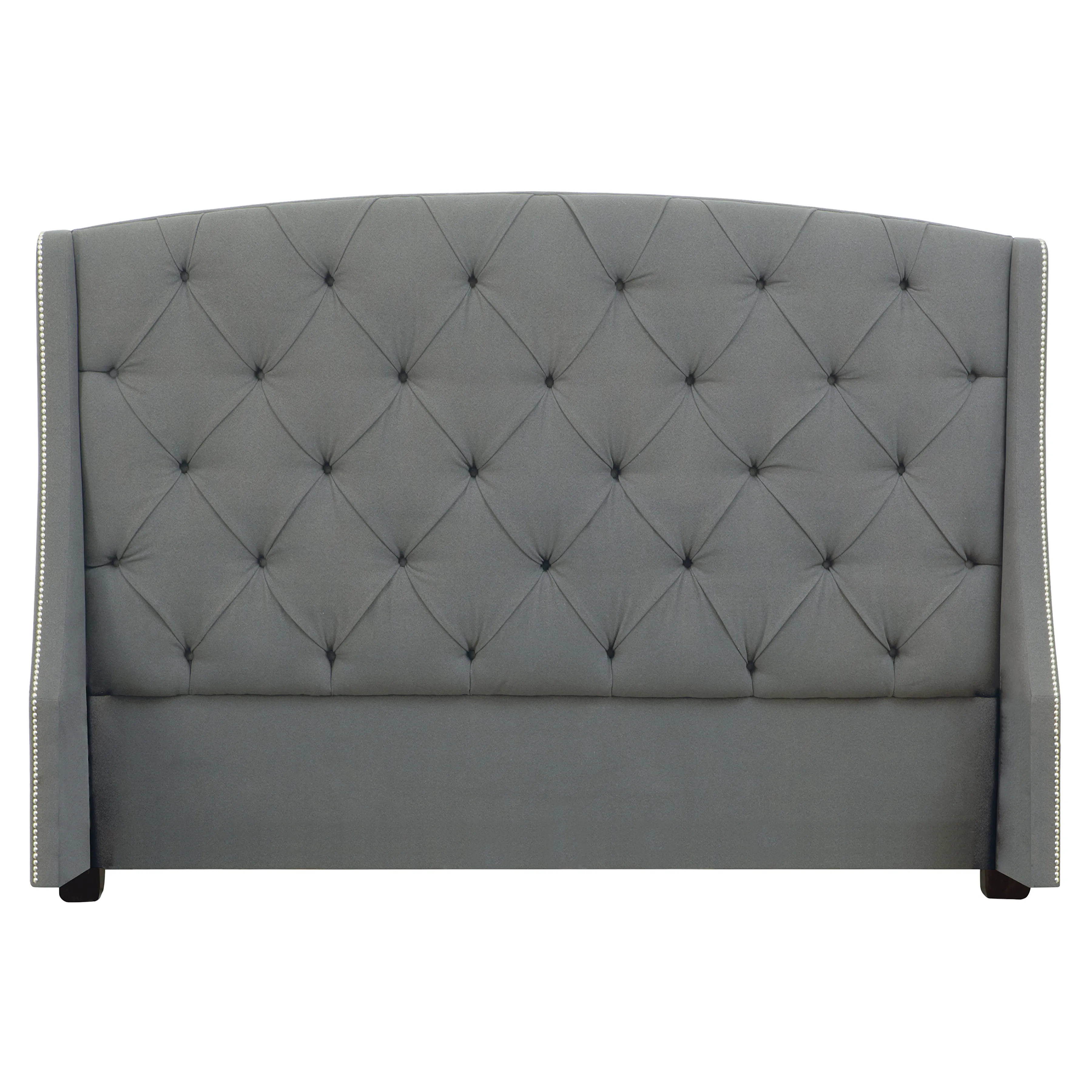 Fully upholstered headboard with "wings". Nail head trim on outside of "wings" and along top rail. Nailhead trim standard on headboard. Headboard designed to be used with display rack. See 750000D. Note: Headboard feet are finished in Smoke (A02) or Espresso (E01).