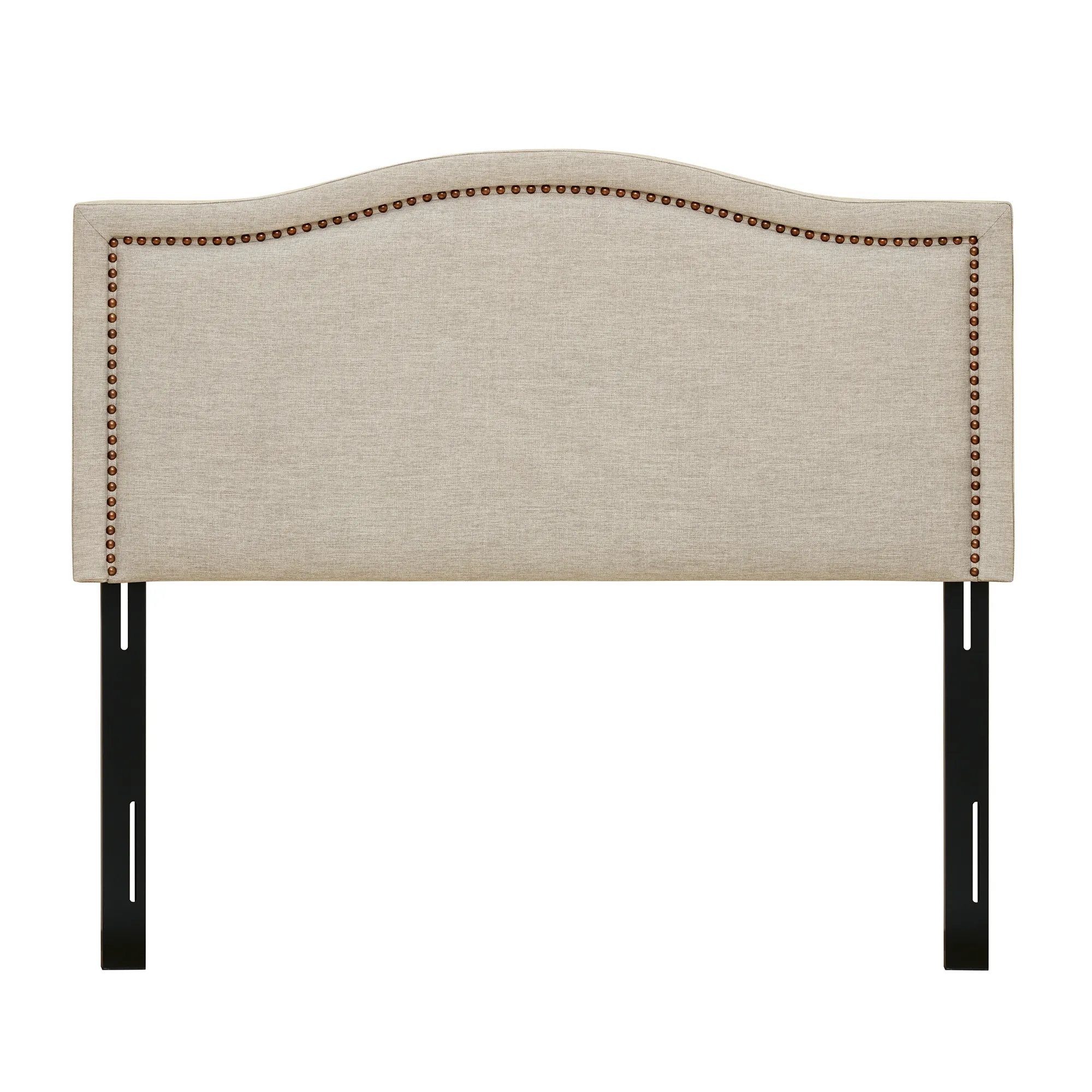 Elevate your bed with the refined look of the Madison Park Nadine Upholstered Panel Headboard. This headboard is upholstered with copper nail heads around the edge to create a chic transitional design. The adjustable black metal legs make it easy to find the correct height to fit your bed frame, while the plywood frame construction provides added stability and durability. Showcasing elegant and clean lines, this upholstered headboard offers a stylish versatility to complement any bedroom decor. Assembly required and tools are included. Hardware (pack B) included to attach headboard to standard bed frame.