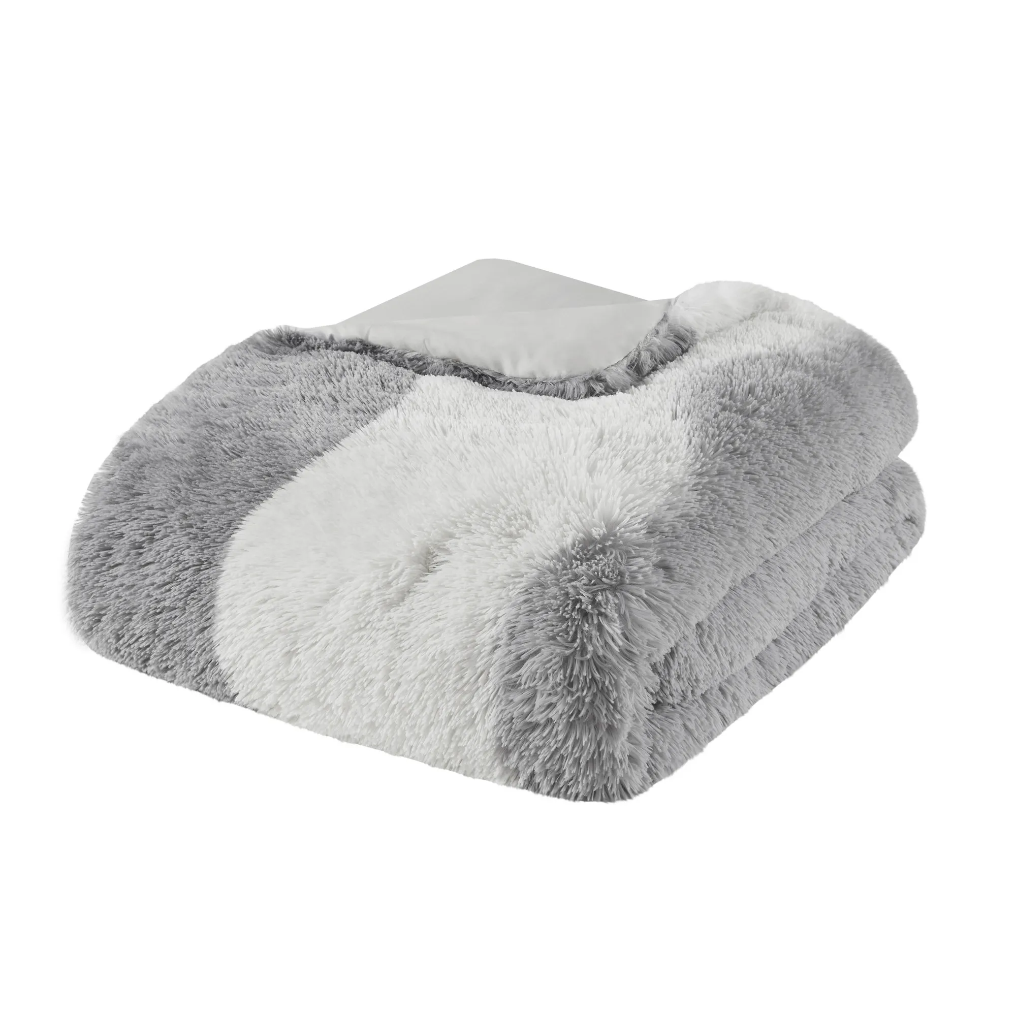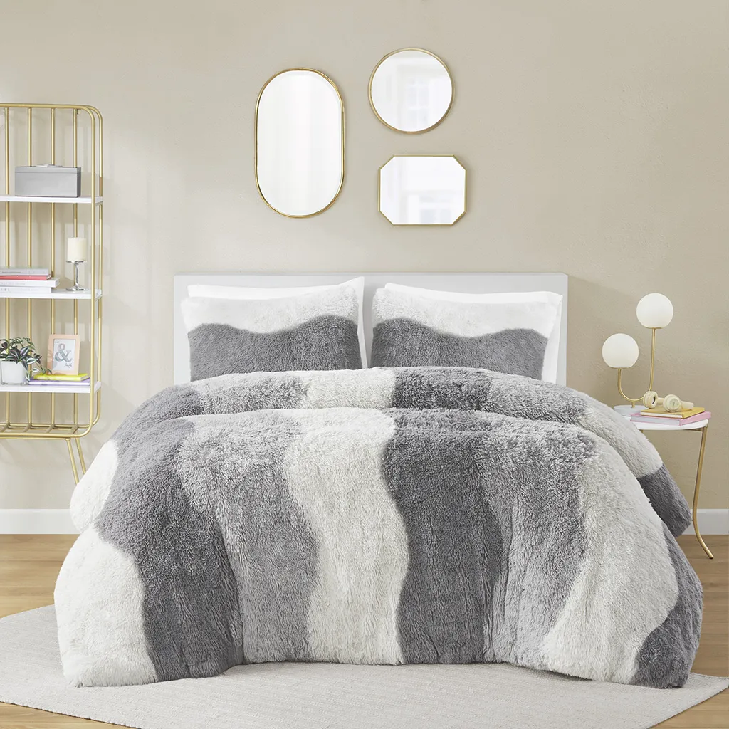 The Cassie shaggy faux fur comforter set showcases a unique, tonal wave striped pattern for an ombre look, and reverses to a soft grey color. This cozy comforter adds a fun and modern update to your bedroom, while coordinating shams (1 in Twin/Twin XL) complete the bedding set. The hypoallergenic polyester comforter filling contains no allergens and is treated to be dustproof. Sham set will vary in ombre colors. This machine washable comforter set is also OEKO-TEX certified, featuring an antimicrobial treatment on the reverse, which keeps the bedding fresher longer.