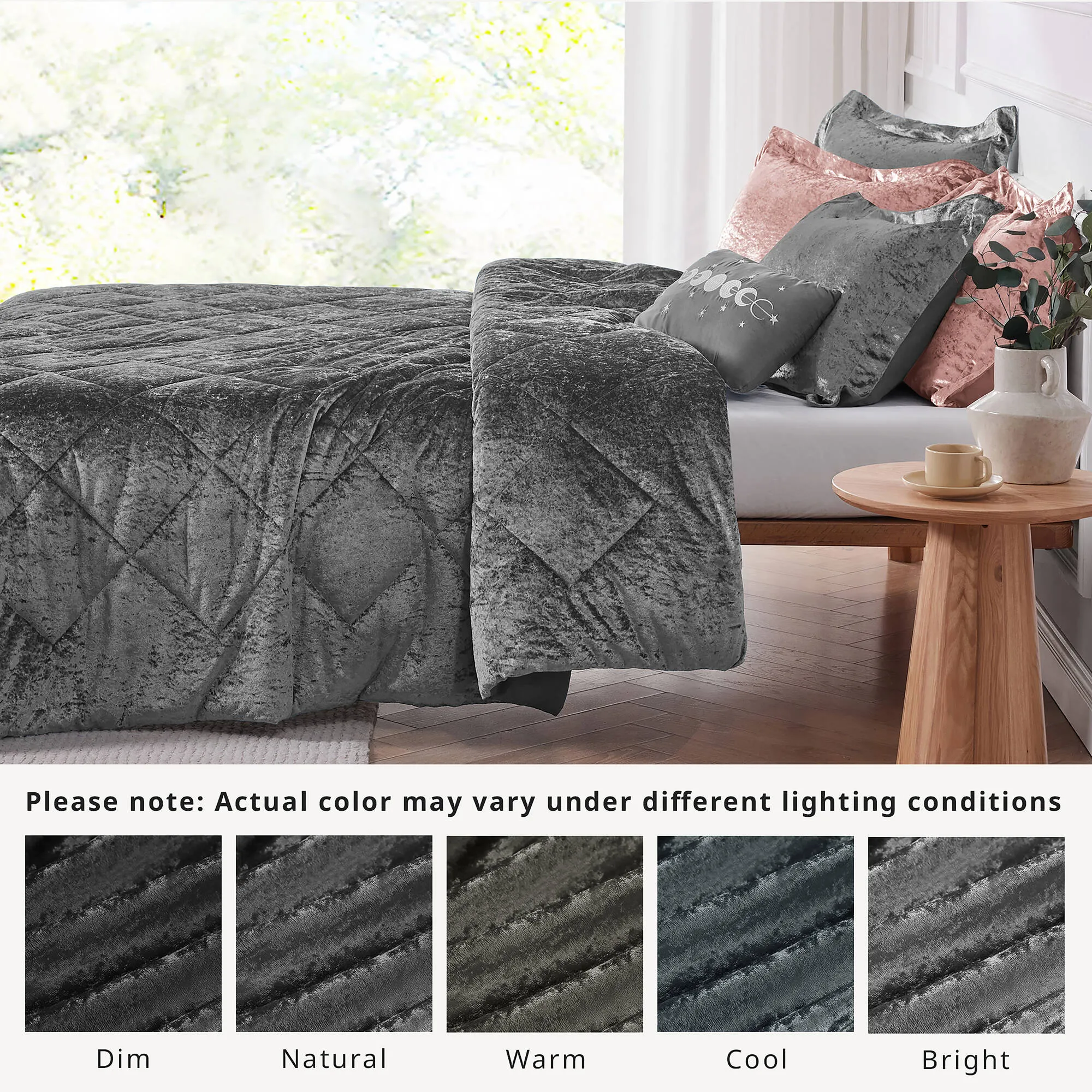 Create a lush and relaxing atmosphere in your bedroom with the Intelligent Design Felicia Velvet Comforter Set. The grey comforter is made from crushed velvet and features diamond quilting for a luxurious look. Matching crushed velvet sham(s) and an oblong decorative pillow complement the comforter to complete the modern style bedding set. Machine washable for easy care, this velvet comforter set uses hypoallergenic filling in the comforter and decorative pillow for extra softness and comfort. Feel the warmth and lustrous beauty of this velvet comforter set when you incorporate it into your bedroom decor. Items in the set may come in a rolled or compressed packaging, which will need to be fluffed up or steam ironed before use to remove wrinkles.