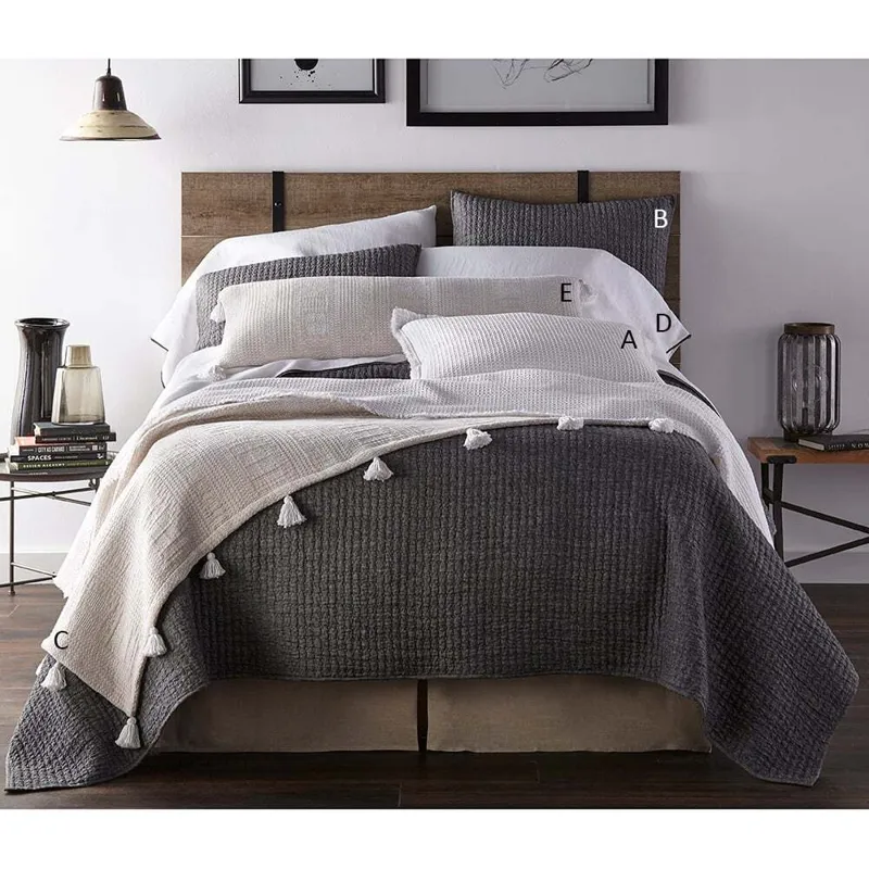 The structured quilting style of Catalina takes on a graphic edge in Asphalt. Paired in stark contrast to Tipton in White, with it’s raw edged flange give this setting an industrial chic effect. Adding Morse Coverlet and XL Bolster in natural adds a graphic note to the pair.