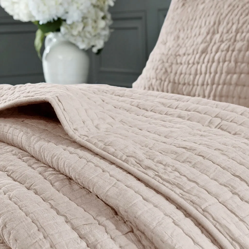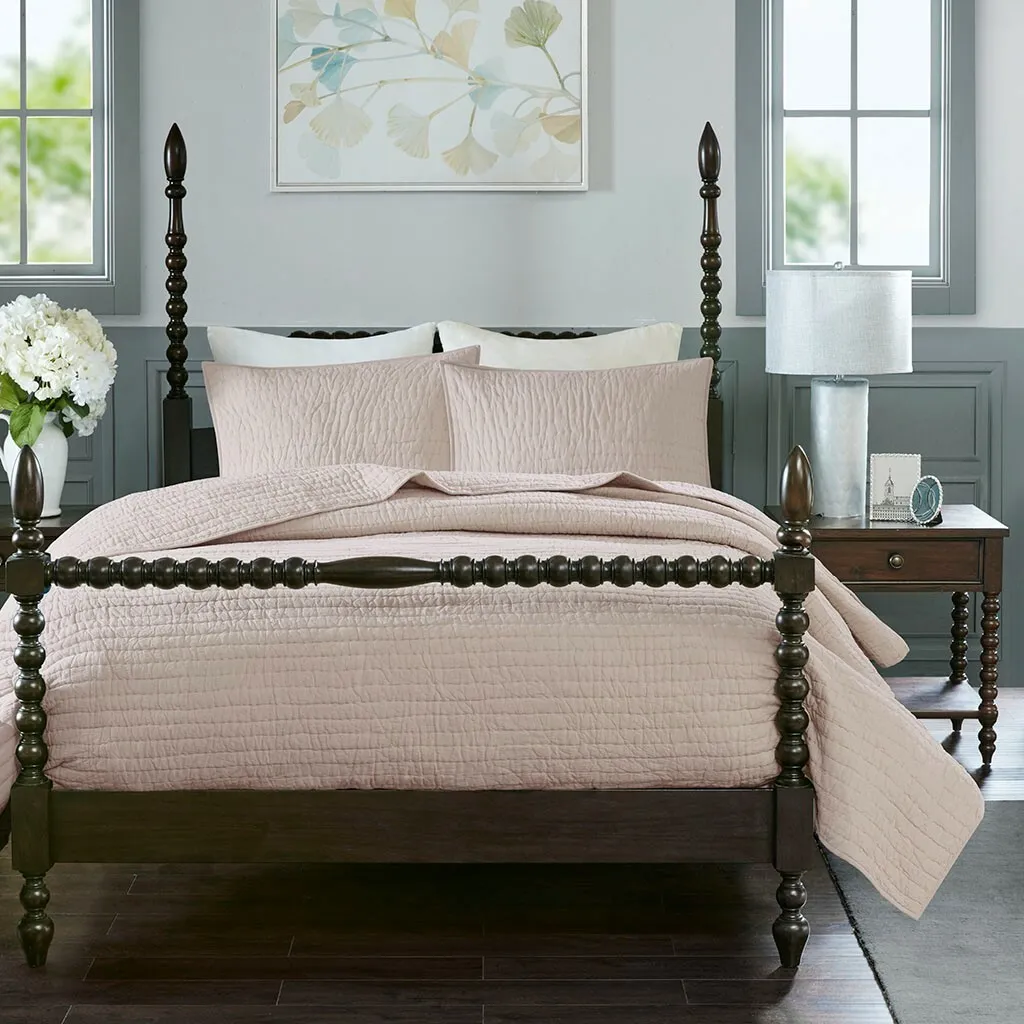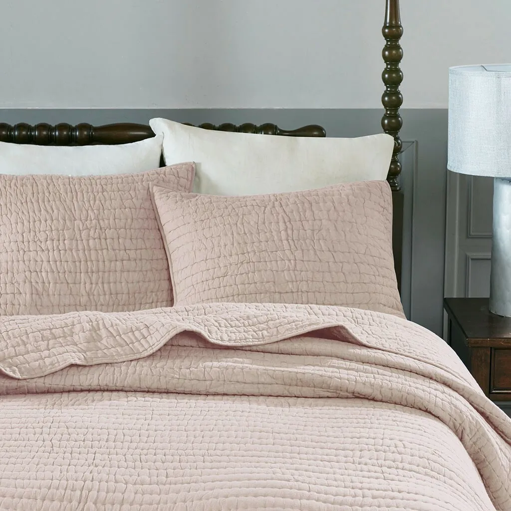 Sleep in luxurious comfort with Madison Park Signature’s Serene Cotton Hand Quilted Coverlet Set. Made from soft cotton voile, this blush coverlet features hand-quilted channel stitching that creates rich texture and dimension to the top of the bed. The cotton-rich filling in the coverlet provides soft comfort, while two matching shams complete the bedding set. Perfect for use in summer or as an added layer in winter, this oversized quilted coverlet is machine washable and offers simple luxury for your bedroom décor