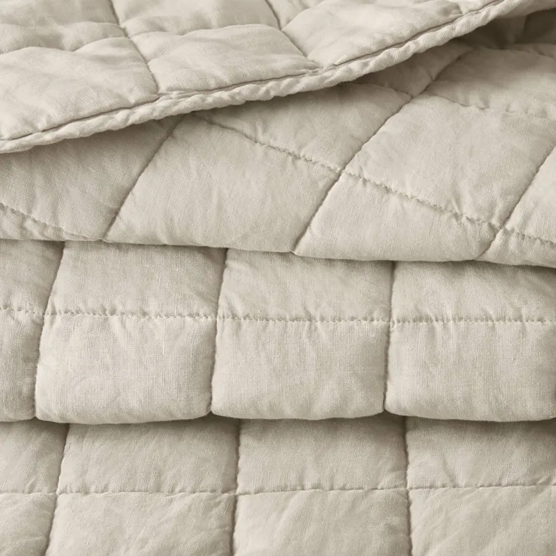 Made from certified French linen and shaped by artisanal hands, this bedding set brings a sense of calm, comfort, and understated luxury to the modern bedroom. The garment-washed quilt feels soft from the start, with added durability to help prevent shrinkage and fading over time—so it stays beautiful, wash after wash. Thoughtfully designed with a balanced 4x4 quilt pattern with piping finish, it adds just the right amount of structure and detail. Matching shams are included to complete the look. Certified by OEKO-TEX®, this quilt set is free from harmful substances and safe for daily use. It also includes a French Linen Certificate of Origin, affirming the authenticity and exceptional quality of the natural fibers used.