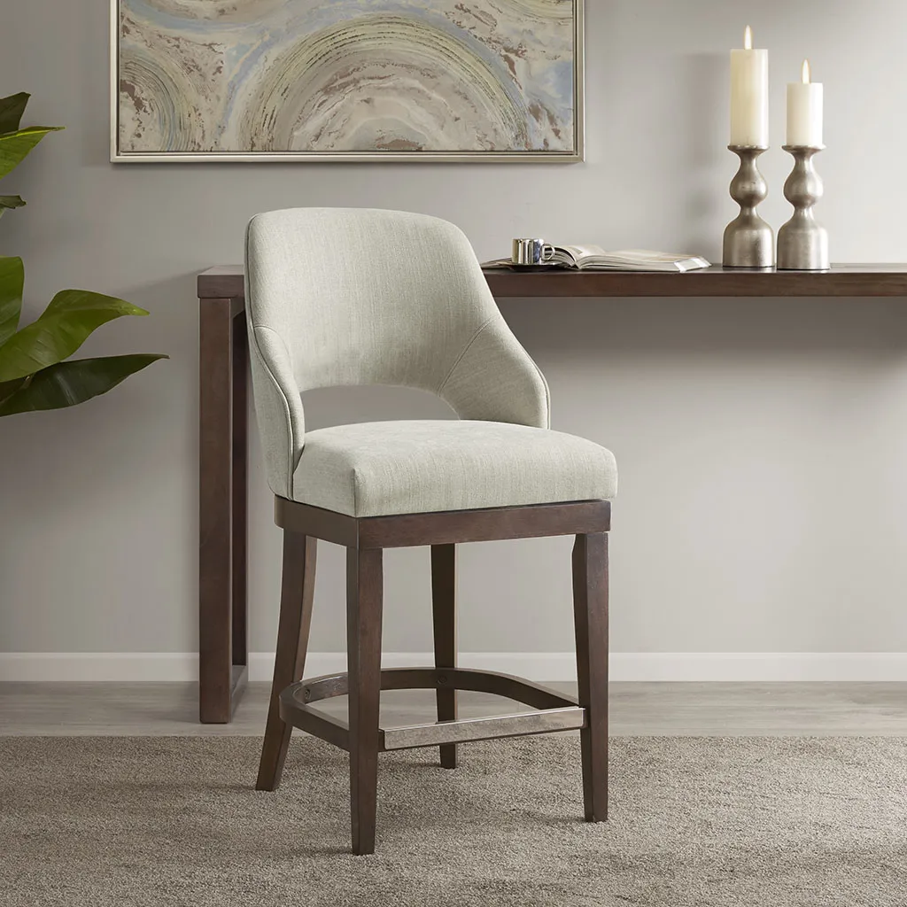 The Madison Park Jillian Counter Stool provides a simple and stylish update to your dining area. This counter stool features an open back design and rectangular seat in rich cream upholstery, for a sleek transitional look. The straight wood legs flaunt a dark brown finish to contrast the upholstery, while a silver kick plate protects the footrest from every day wear and tear. Elegantly crafted, this counter stool offers a stunning update that perfectly fits with any transitional dining room. Assembly required, tools included.