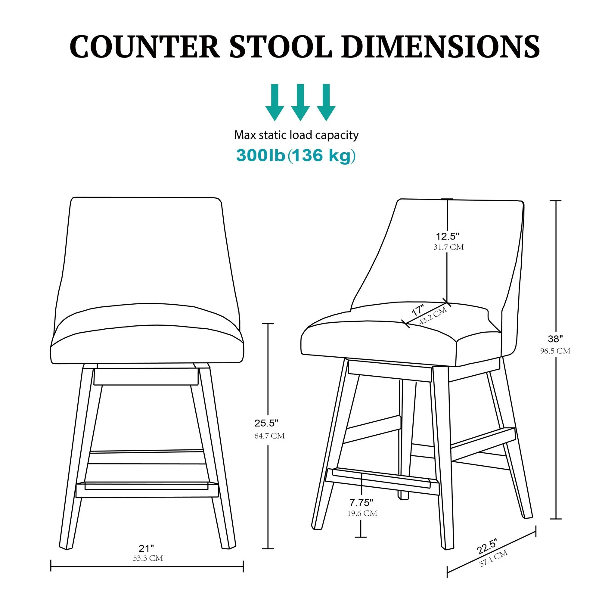 - Seat Dimension: 21"W x 17"D x 25.5"H
