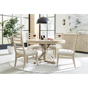 A transitional style dining collection made of beautiful Oak veneers complimented by antique brass finish accents and hardware. The extendable dining table includes a self-storing butterfly leaf for seating up to 8 people. Other pieces include special features such as performance fabric, wine storage and built-in power outlets.