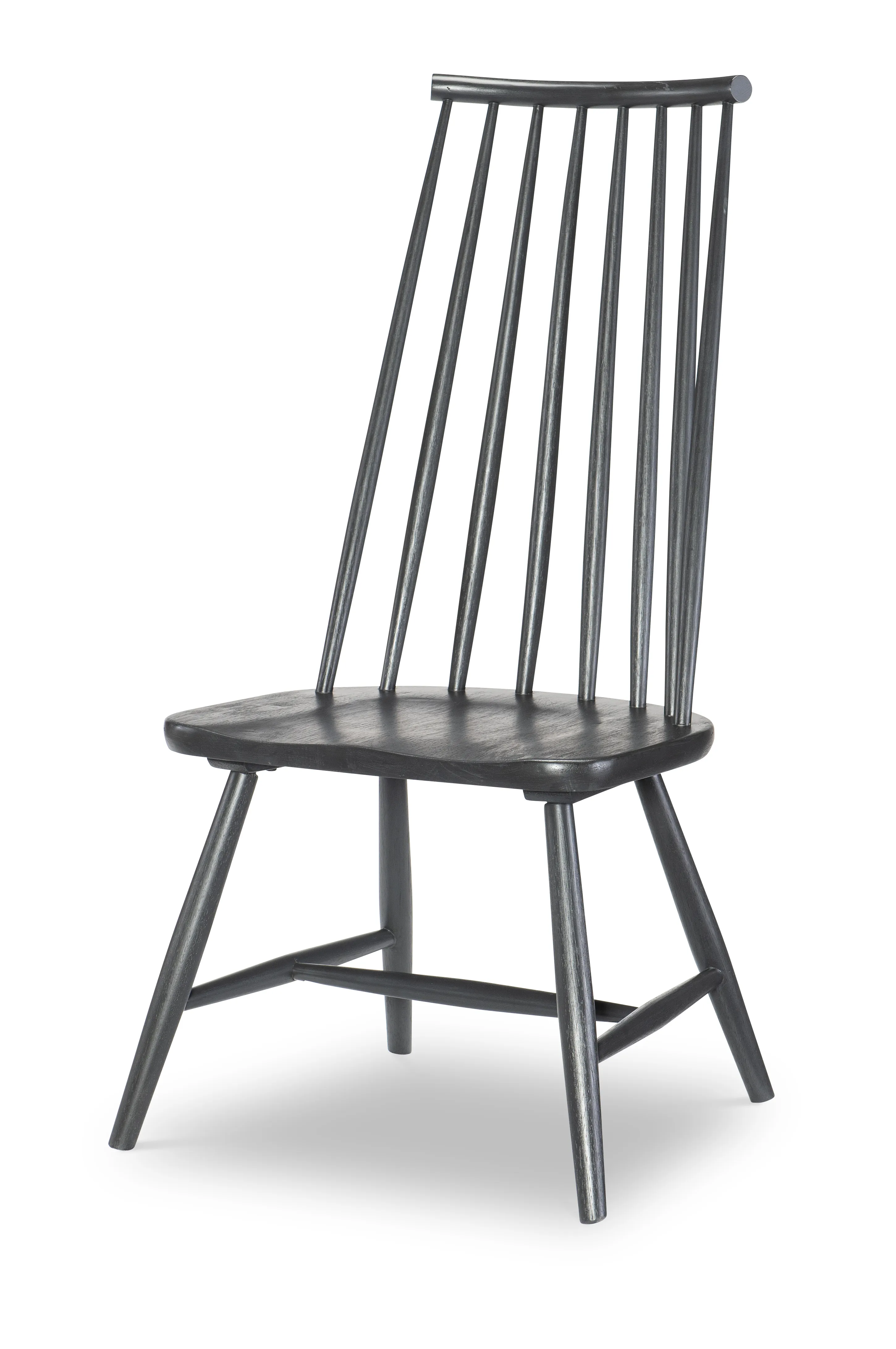 Concord is a dining collection offering a modern blending of styles. Eclectic details such as canted legs on the table, tall spindle back chairs, simple framed drawer and door fronts merge perfectly with the upscale tone of the Charred Oak finish and Matte Gold hardware. Crafted on quartered white oak veneer with slight wire brushing that allows light to subtly reflect off the natural grain.