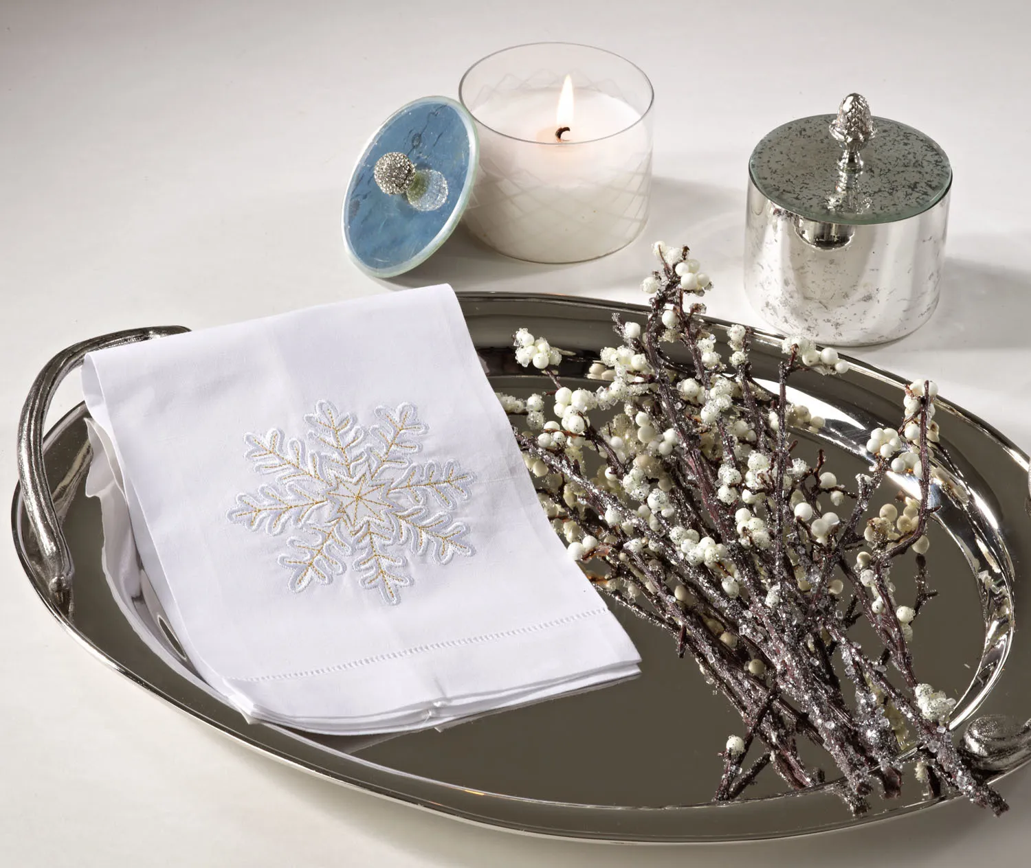 Embroidered and hemstitched snowflake design towel. 55% linen - 45% cottonimported