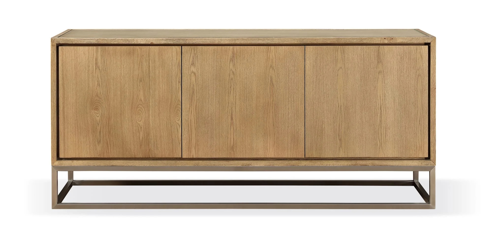 - The soft luster of a brushed stainless steel metal base contrasts gently with quartered and straight grain white oak in a dry natural tone
