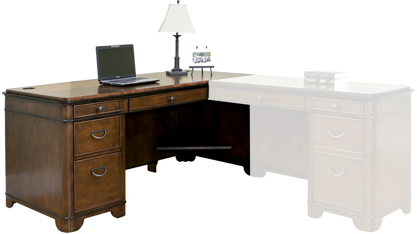 Inspired by the kathy ireland Home™ Architectural Style Guide™ and Biedermeier style, the Kensington collection is comfortably contemporary, showcasing a warm fruitwood finish and contrasting black cove and black bead molding. The tops have reversed diamond matched veneers with a black inlaid border. The posts of the cases are quarter-round and the drawers are accented by half-round molding and ash colored drawer pulls. Kensington is crisp and contemporary without seeming out of place in traditional settings because of the warm finish and understated design elements. This style is deeply influenced by clean lines, minimalism and simplicity; where form follows function. Understated colors with an emphasis on neutral tones combine to produce a sophisticated, appealing and comfortable style. Products inspired by this Style Guide™ are designed to mix easily with furnishings and accessories from other time periods to create an unmistakably modern feel with impeccable flair.