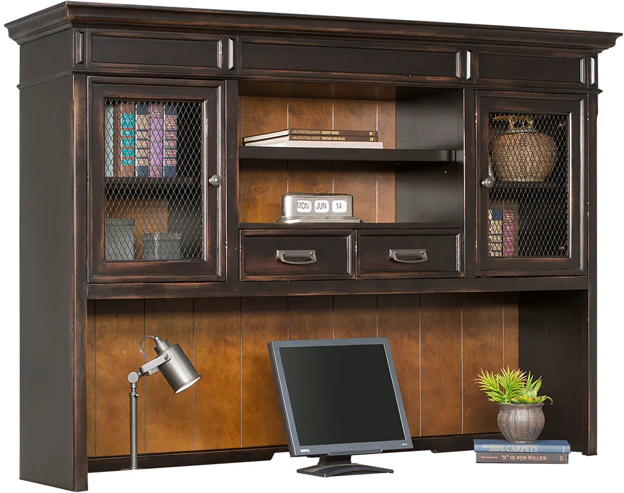 The Hartford collection combines bold lines with a weathered, vintage finish and classic style elements. The warm, two tone rubbed finish gives Hartford the relaxed feel of old world wood and the sophisticated turnbuckle and wire mesh details add a formal element. The Hartford collection will be right at home in either a classic formal setting or a more relaxed, eclectic home.