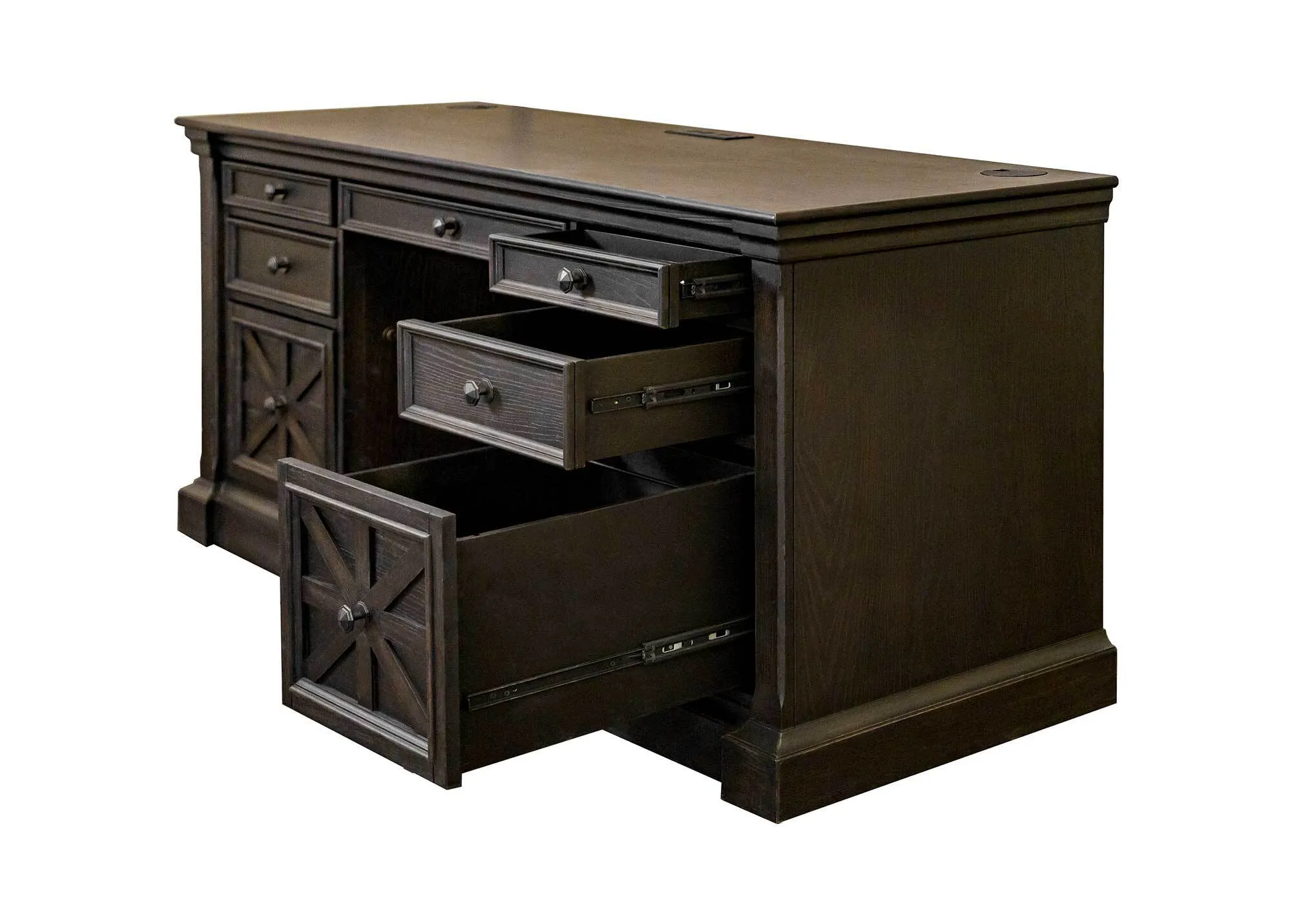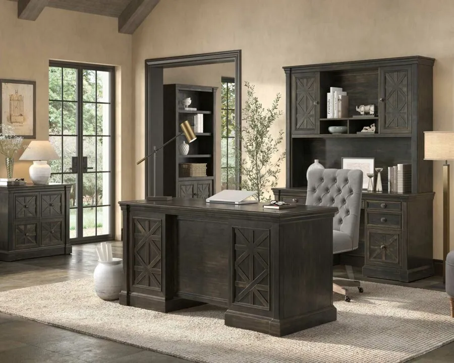 Kingston emanates an air of the English country manor. Dark chocolate rub through finish is softly worn to enhance the wood and give a naturally aged look to the collection. Criss-cross detail adds interest and dimension to drawer fronts and panels, while mottled antique hardware enhance the look of the group.