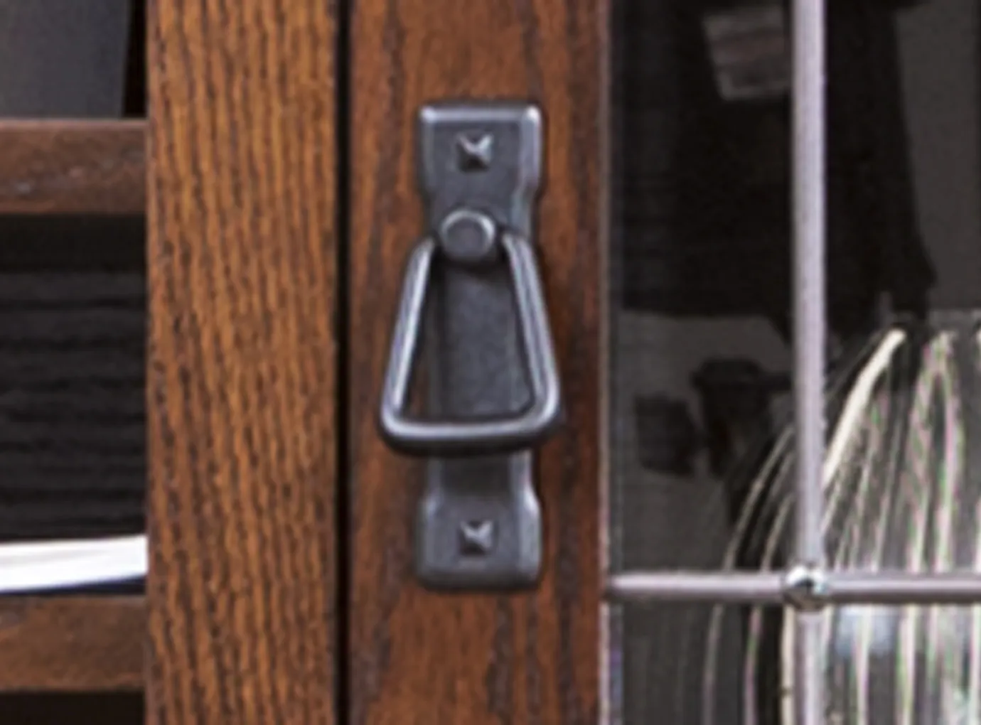 - Two adjustable shelves behind lead accented glass doors
