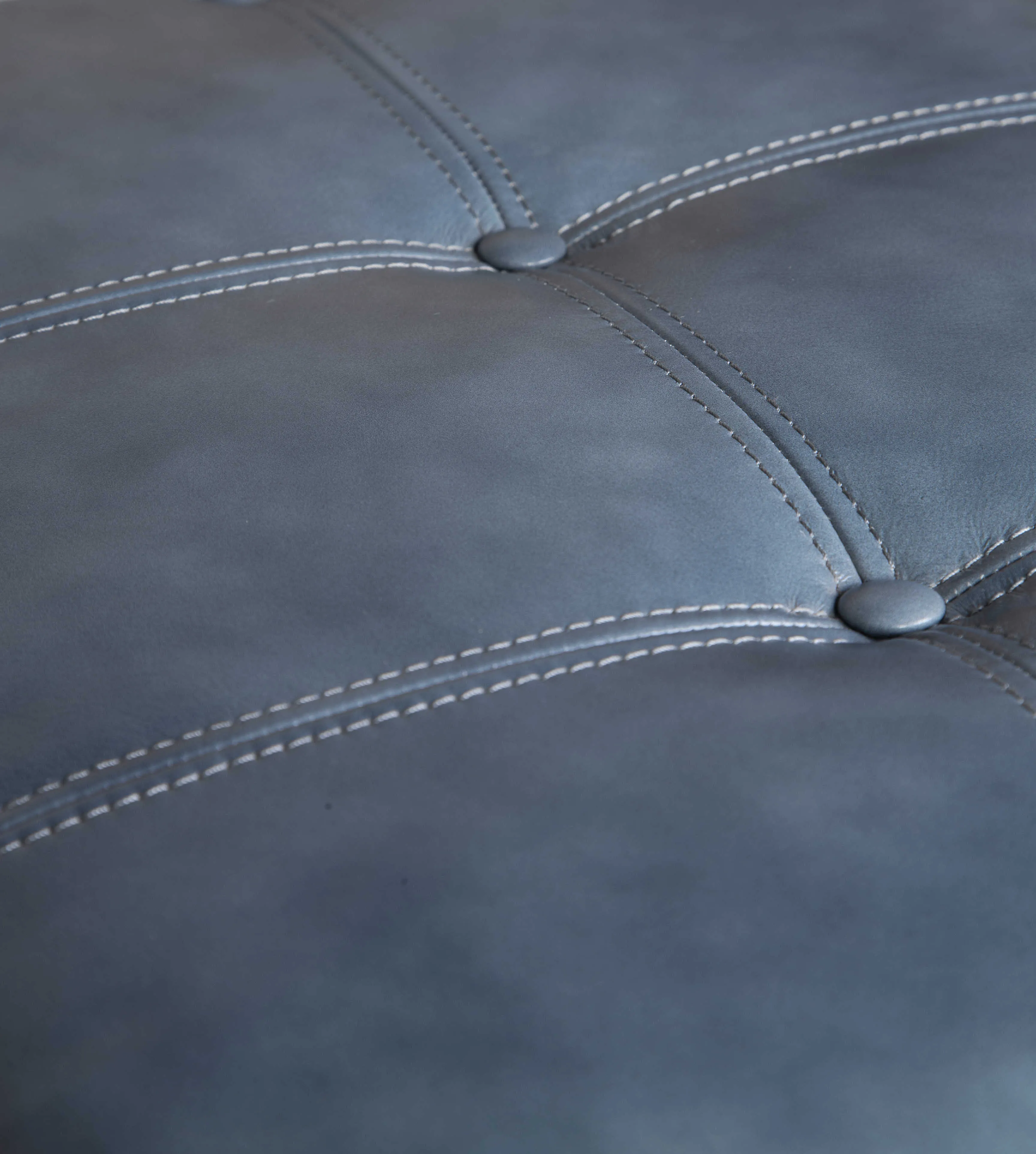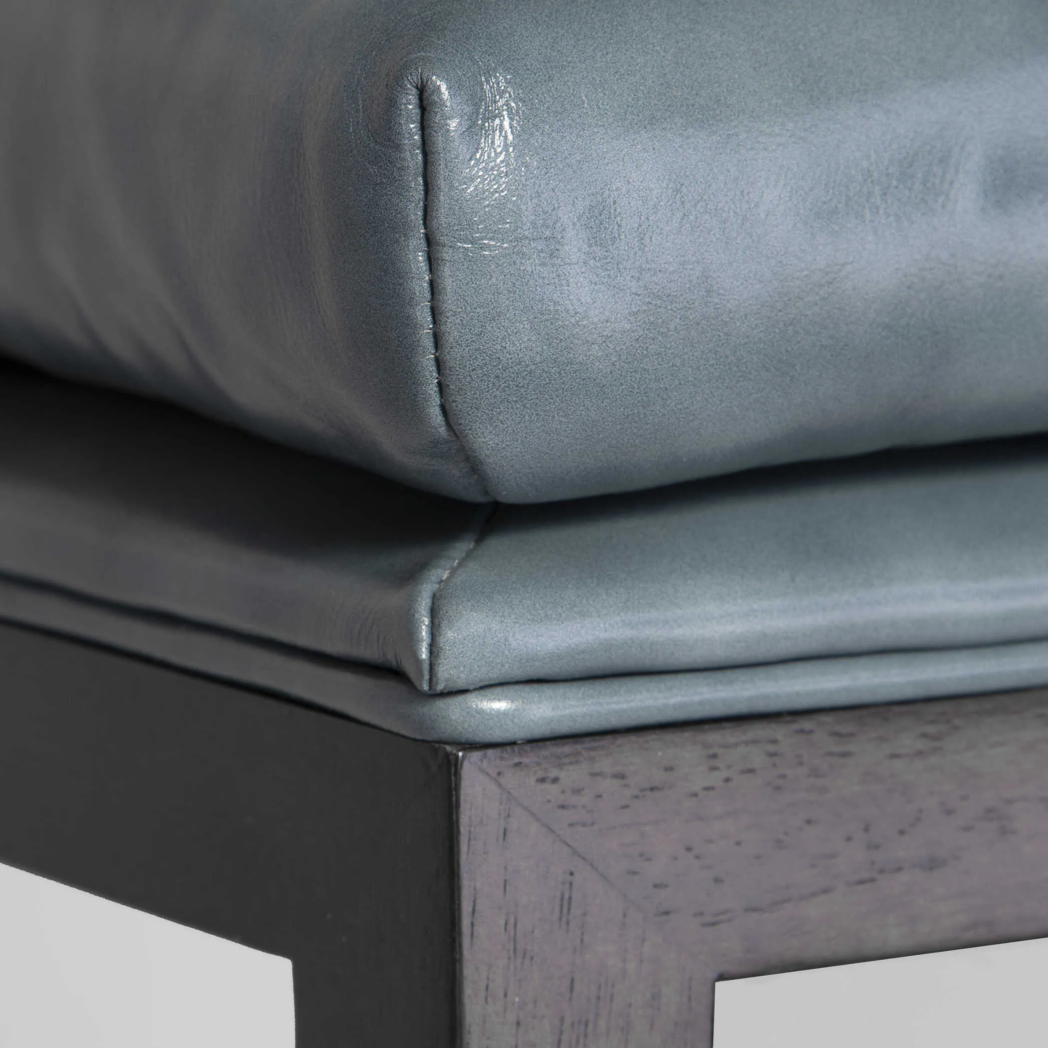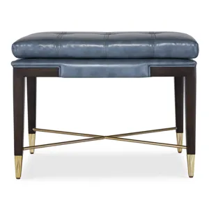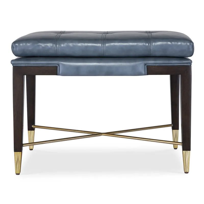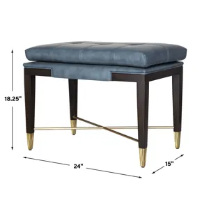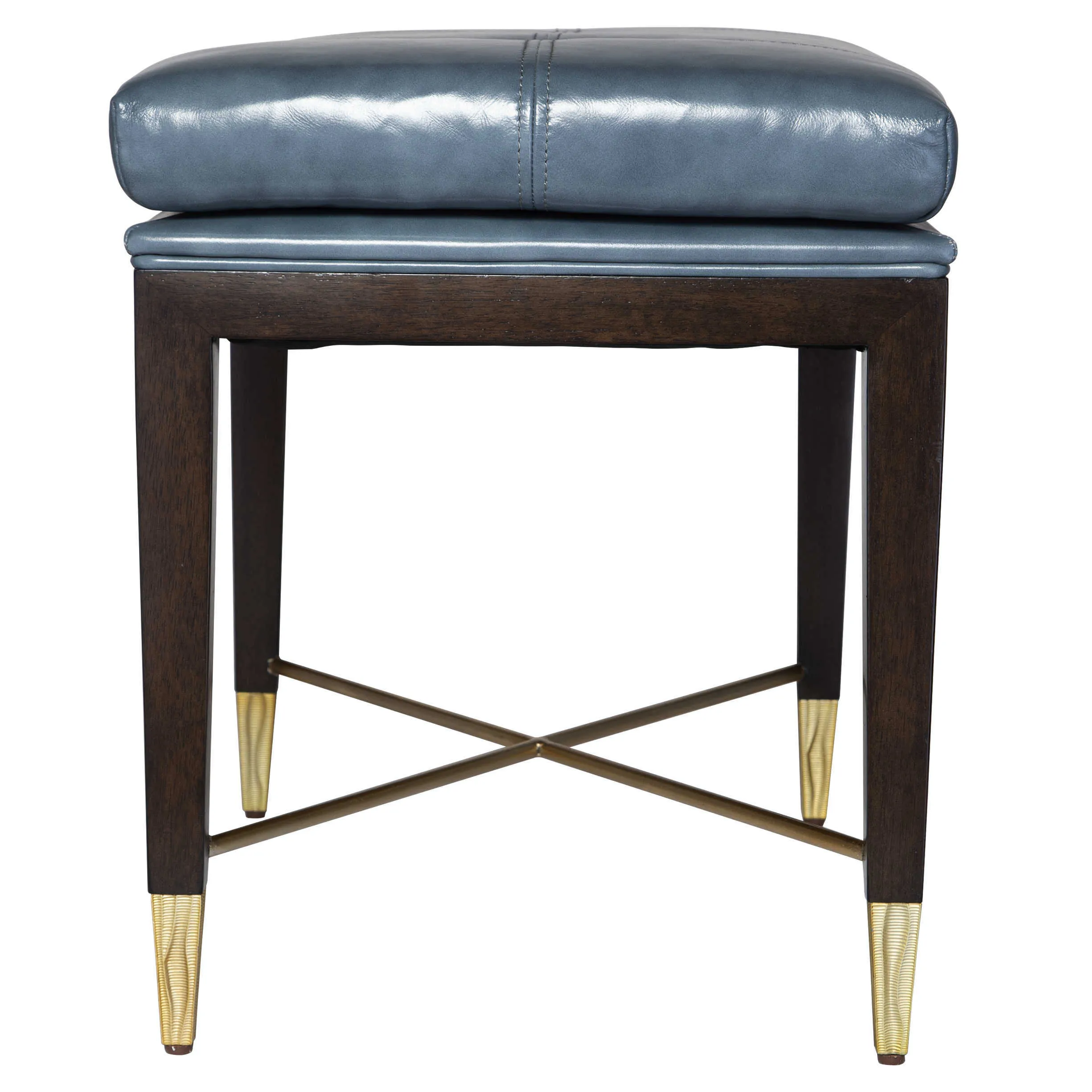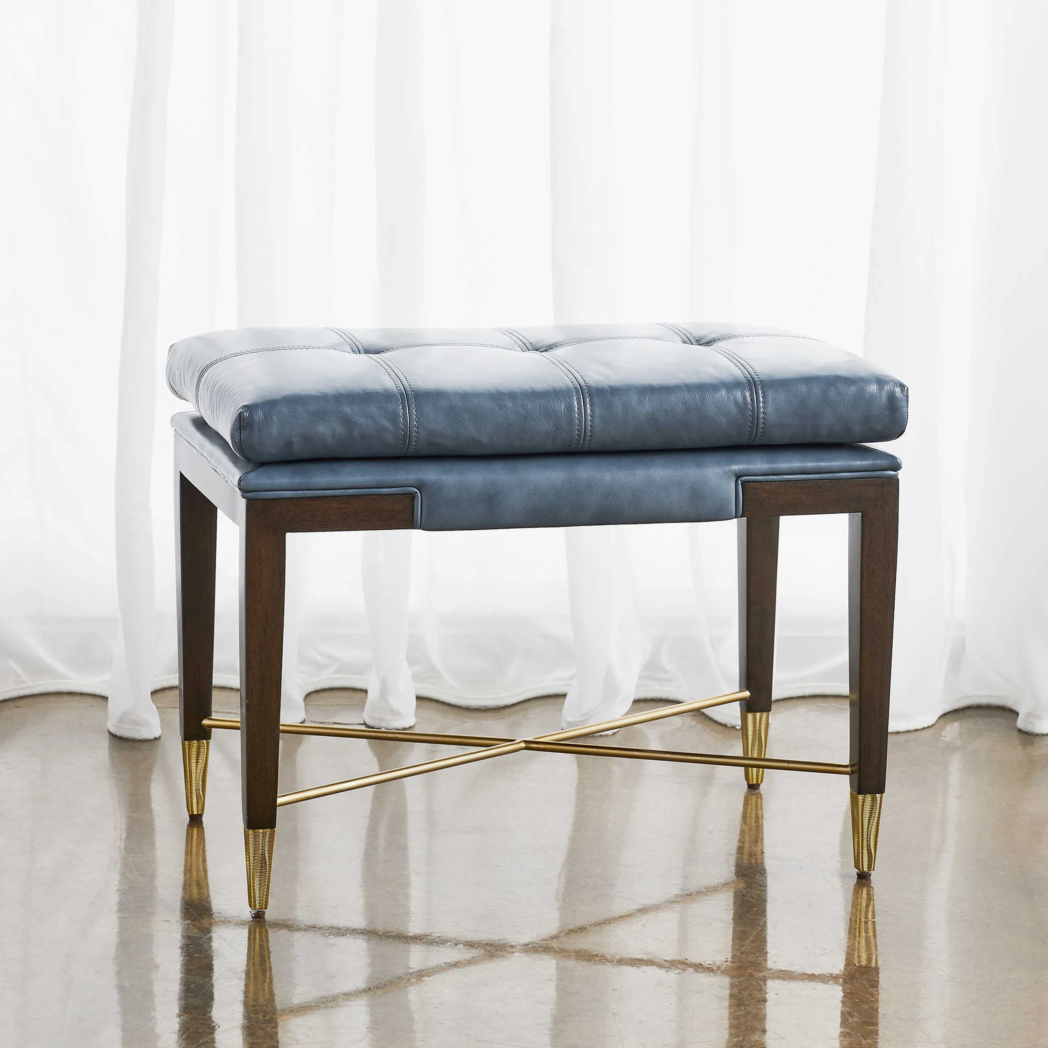 Seductive tapered legs are capped with dazzling gold finished metal feet. A removable tufted blue top grain leather seat cushion provides maximum comfort. Made of rich walnut veneer, the High Heel Bench will provide beauty and function in any room it inhabits. Seat height is 18".