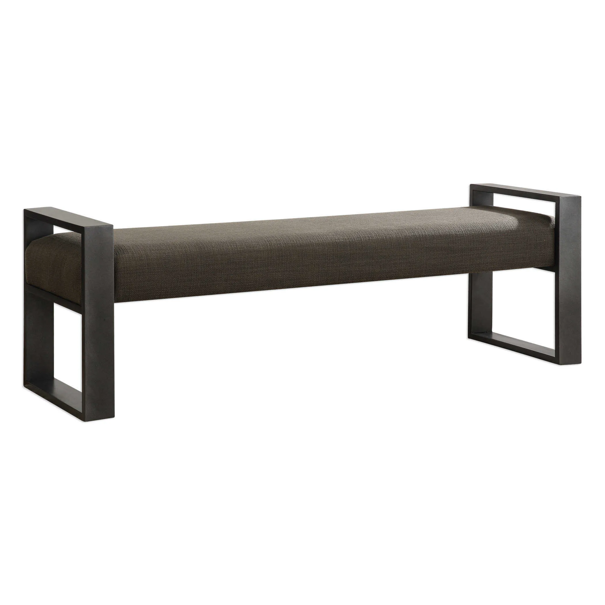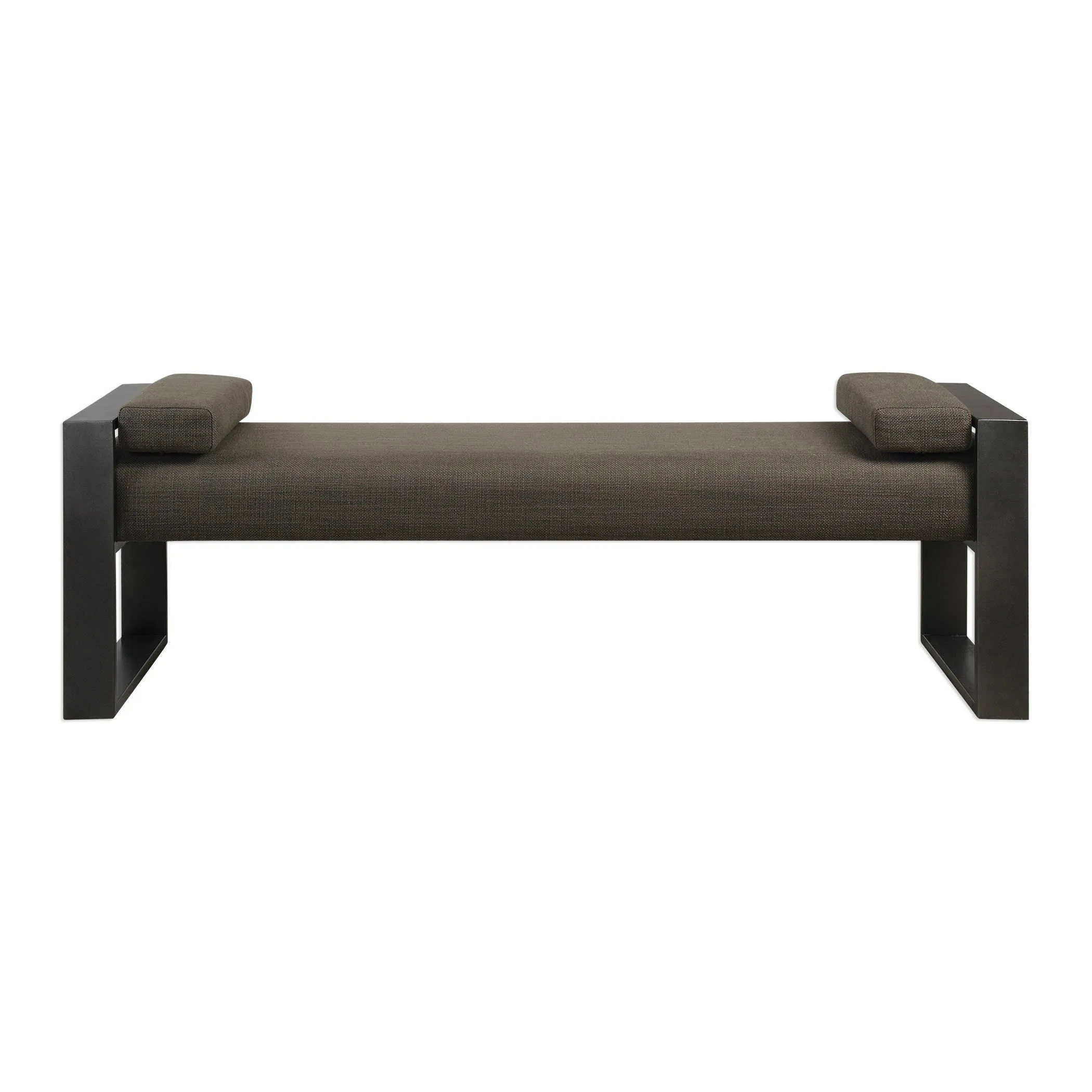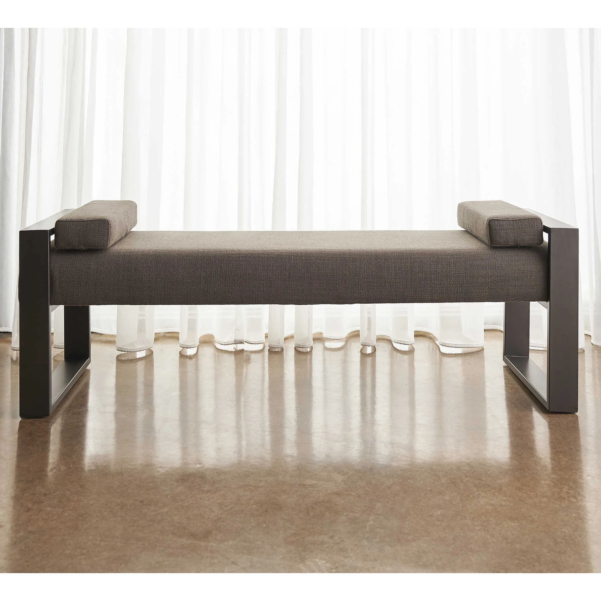 Simplistic in design with a contemporary feel, featuring thick iron legs finished in a brushed steel, covered in a taupe gray woven fabric with two accent pillows. Seat height is 17".