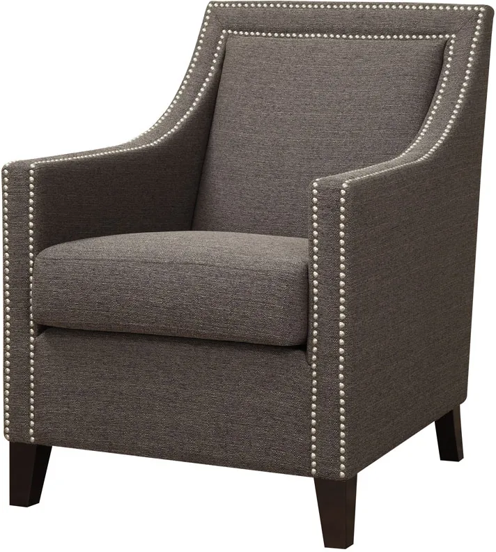 Emerald's Janelle Chair is the ultimate in comfort and elegance. Boasting a deep seat, this chair offers plenty of room to kick back and relax. This accent chair is offered in two color options: deep charcoal-brown and light beige. The luxurious upholstery and flawless nail-accented silhouette make it a chic addition to any room in your home.