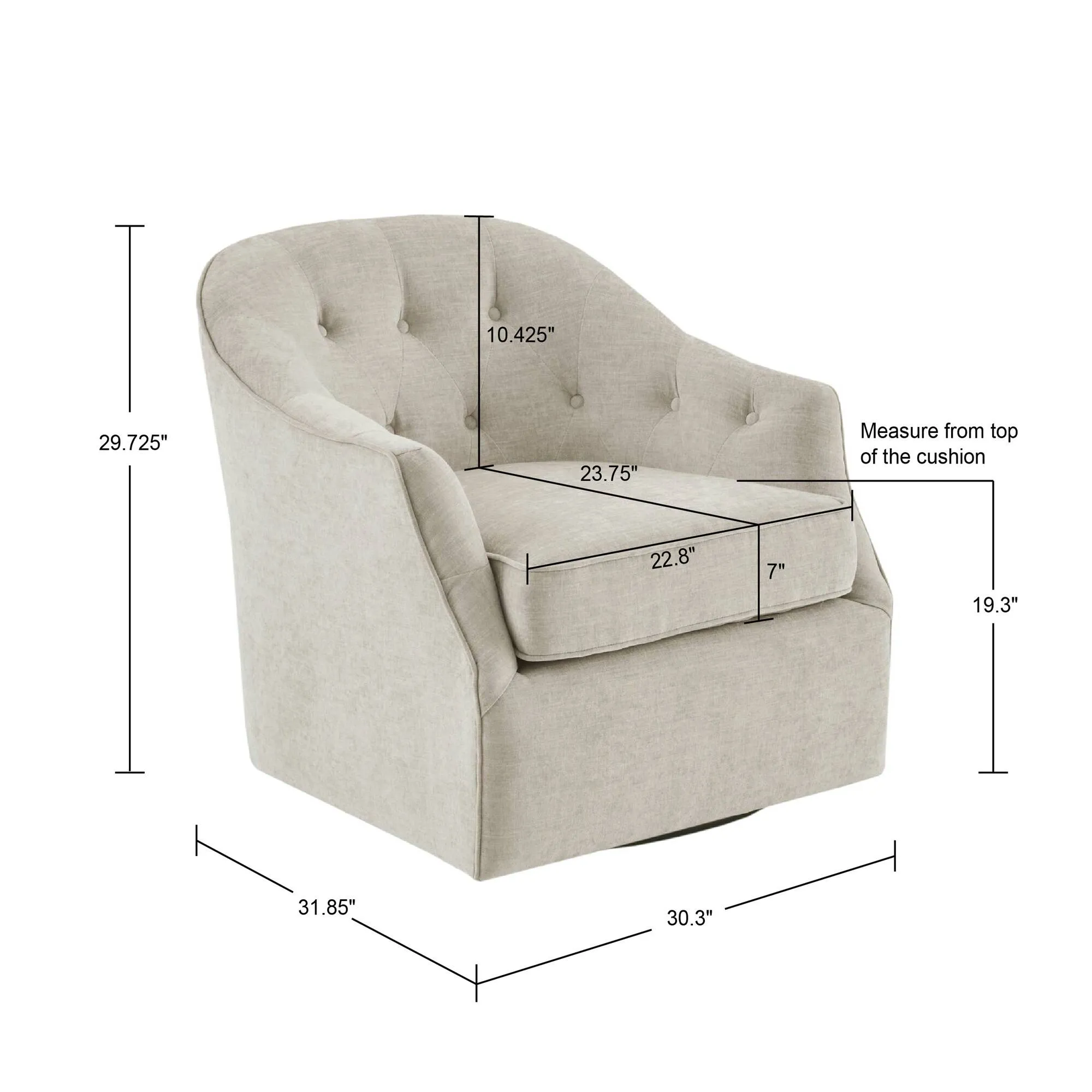 Classic meets contemporary with the Madison Park Calvin Swivel Chair. Upholstered in a soft natural-hued fabric, this swivel chair features a curved button-tufted back that creates a charming and elegant design. The high-density foam filling and solid wood frame provide exceptional comfort and support, while the swivel feature allows the lounge chair to rotate 360 degrees on its black metal base. No assembly required.