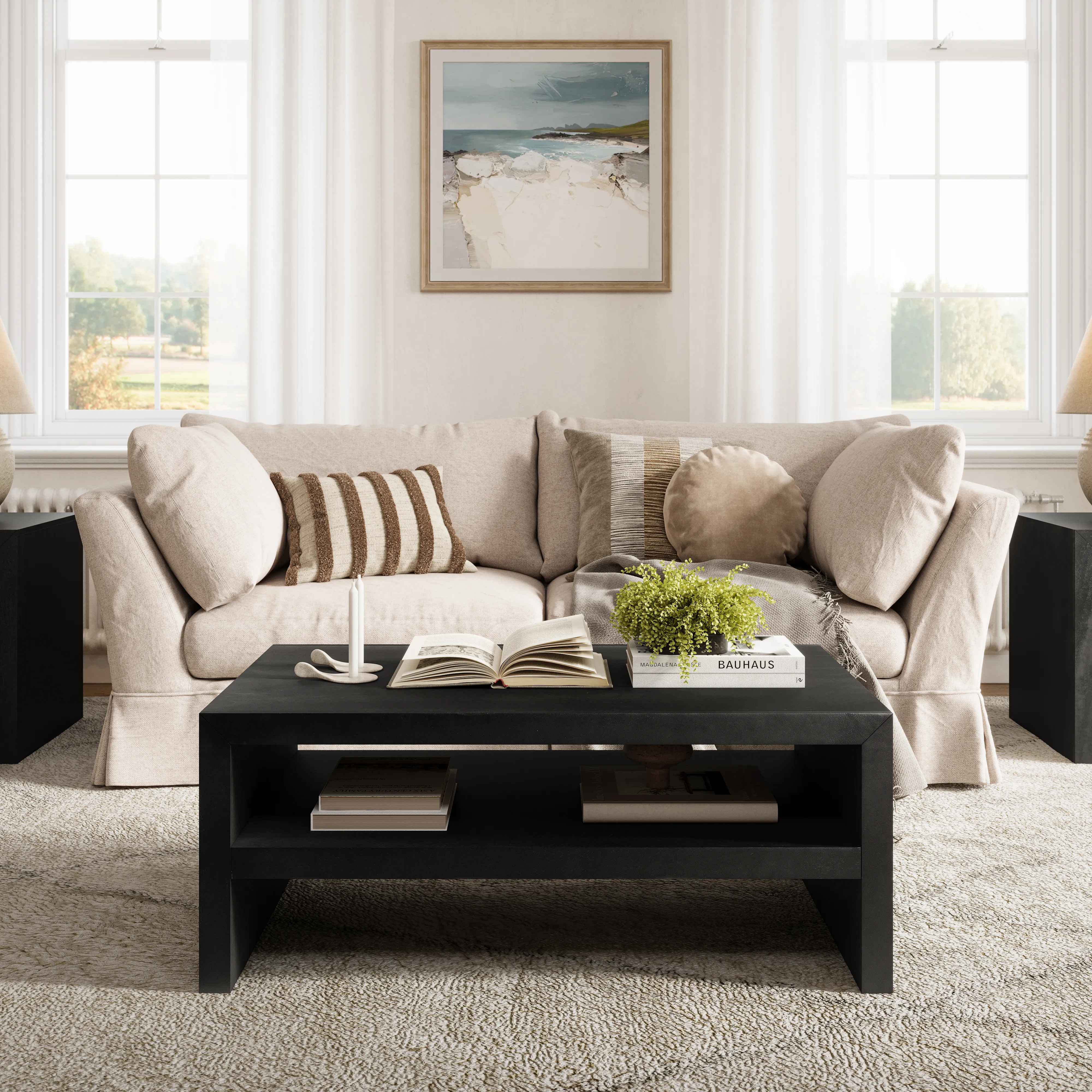 Crafted from robust Acacia hardwood, our Dev Modern 44-Inch Mitered Angle Coffee Table exudes contemporary elegance. Each piece showcases the intricate beauty of natural wood grain, adding depth and character to any space. The 45-degree mitered joints create crisp, squared edges, elevating its modern aesthetic. Its sleek design is a fusion of simplicity and sophistication, making it a versatile centerpiece for any living area.With a built-in storage shelf, this coffee table seamlessly combines form and function, offering practicality without compromising on style. Whether you're hosting gatherings or enjoying quiet moments, its ample surface provides the perfect canvas for your dcor and essentials. Elevate your living space with the timeless allure and practicality of our Dev Modern Coffee Table.