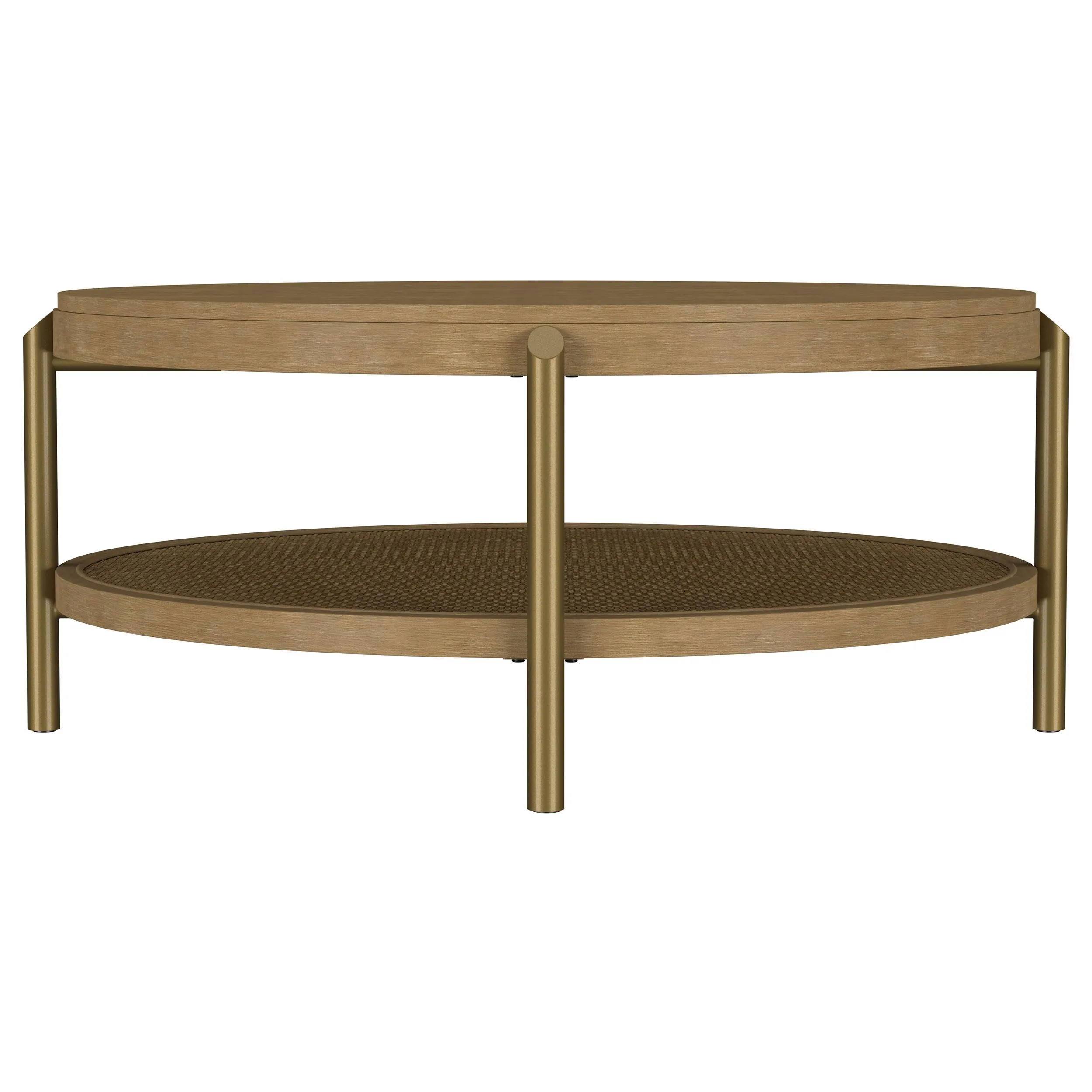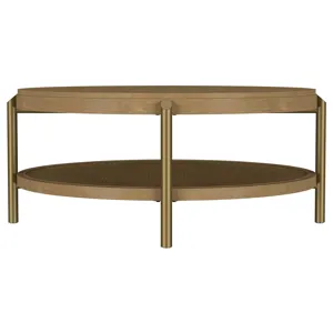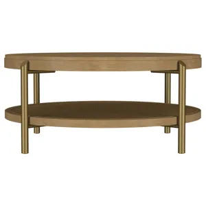 This round coffee table combines modern design with rustic charm, perfect for today’s living spaces. Crafted with rubberwood, engineered wood, and ash veneer, its smooth finish highlights the natural wood grain for an organic appeal. The lower shelf features woven rattan, offering practical storage and a textured look. Supported by aged brass-finished metal legs, this cocktail table delivers a balance of durability and style, serving as a functional centerpiece for any living room or lounge area.