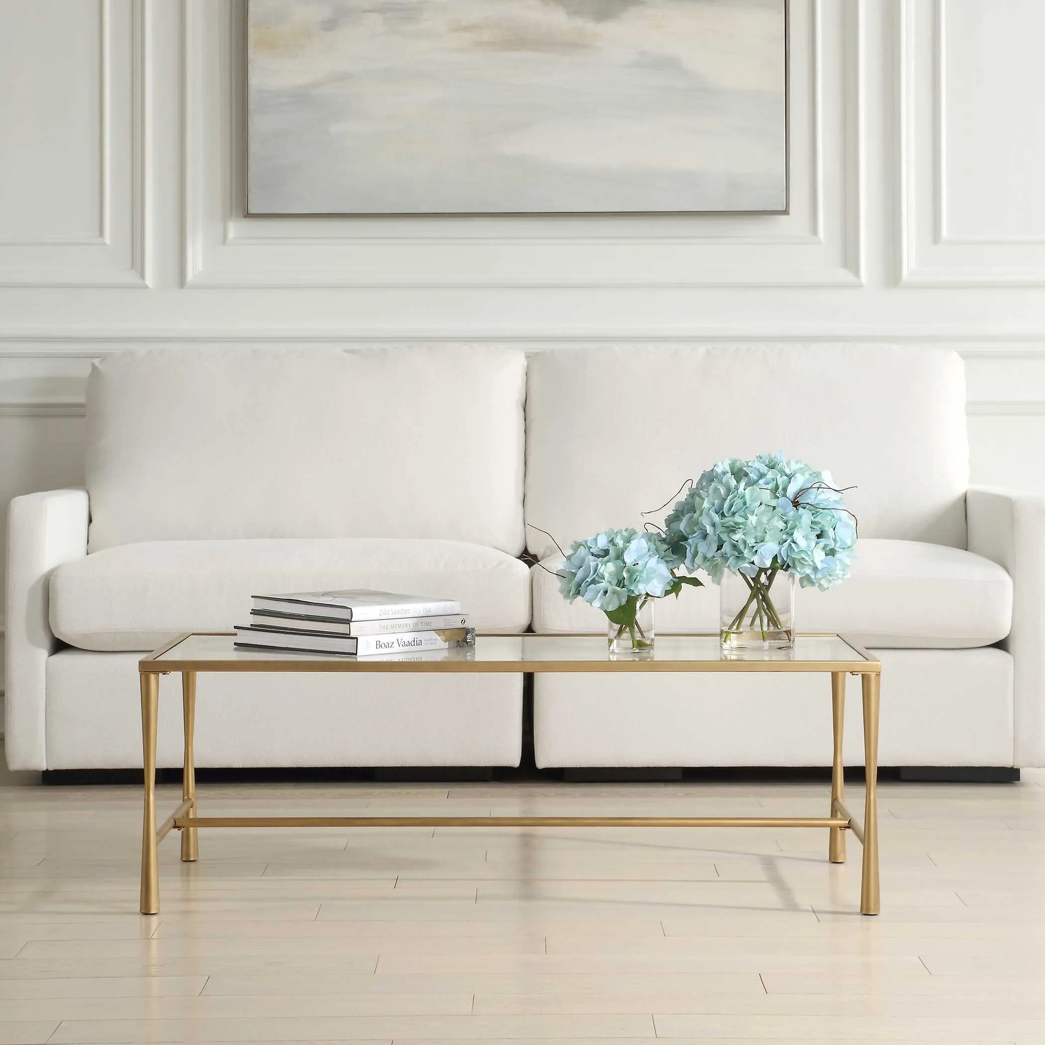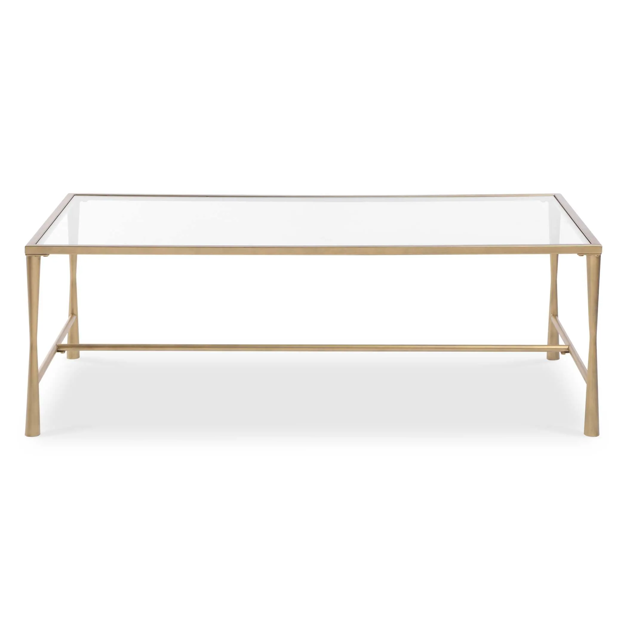 Crafted from durable iron and finished in a beautiful antique gold, this coffee table features a spacious tempered glass top. The legs have a tapered design that gracefully flares out at the bottom, adding visual interest.