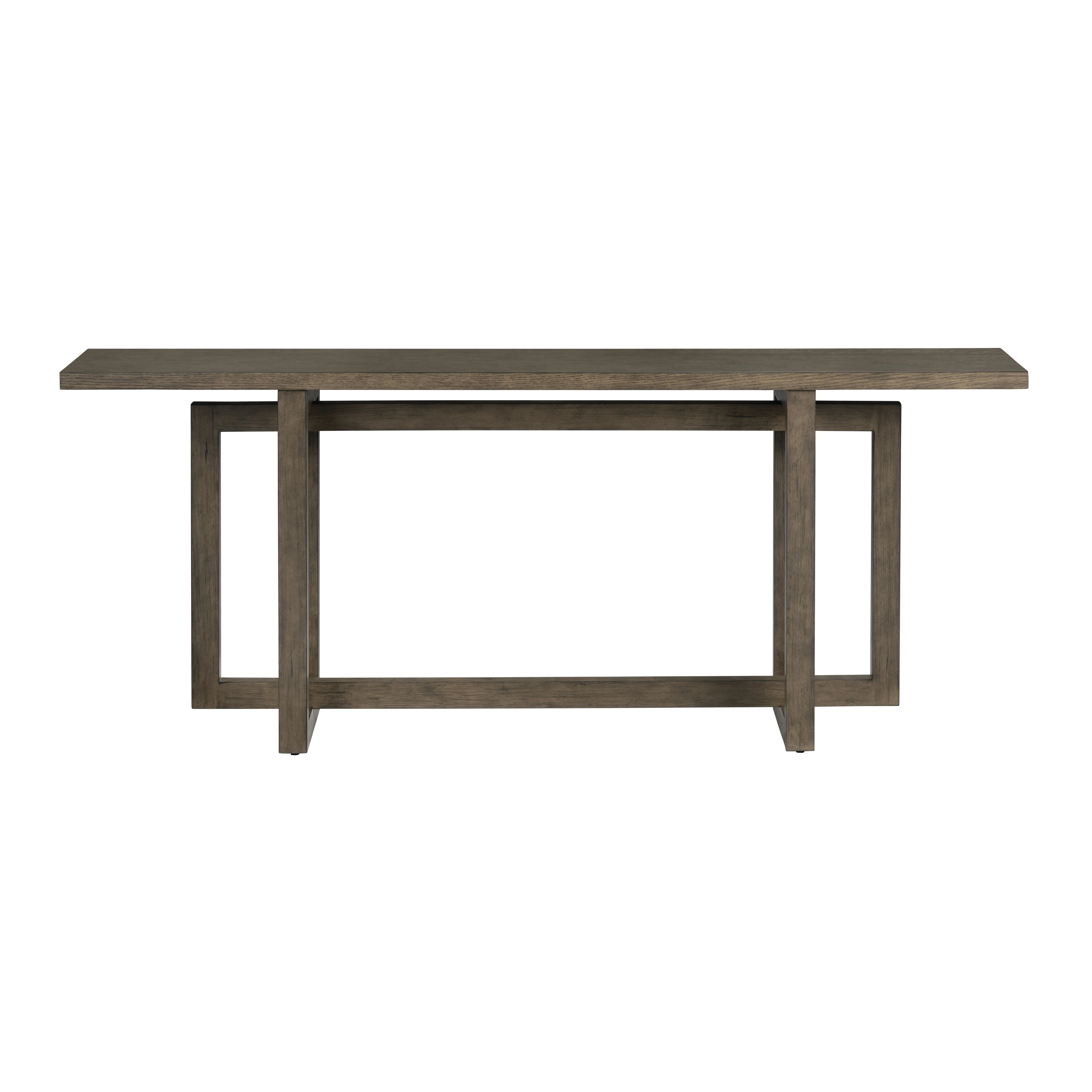 Add a refined touch to your space with this brown wooden console table, featuring a sleek, elongated top and a uniquely designed geometric base. The base consists of interlocking rectangular frames that provide both structural support and a modern, architectural aesthetic. Crafted from durable wood, the open-frame design adds an airy feel while ensuring stability. The rich brown finish enhances its warm, sophisticated appeal. With minimal assembly required, this table is an effortless yet stylish addition to any entryway, hallway, or living space