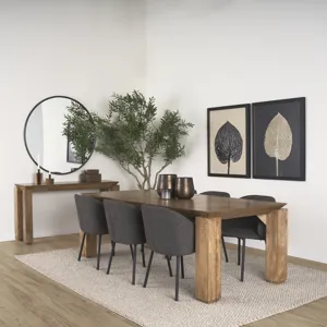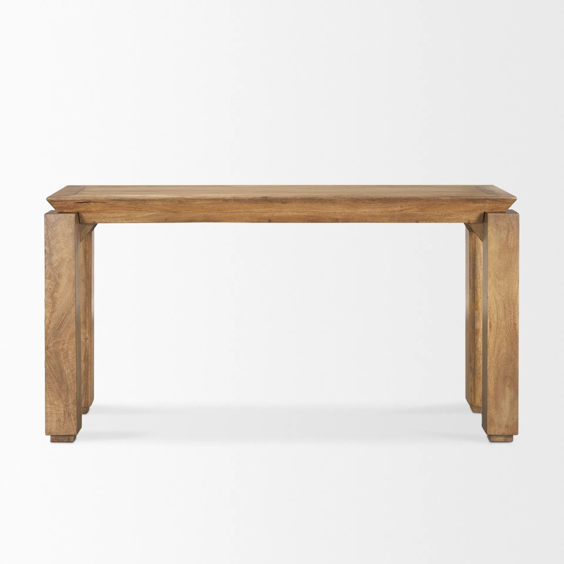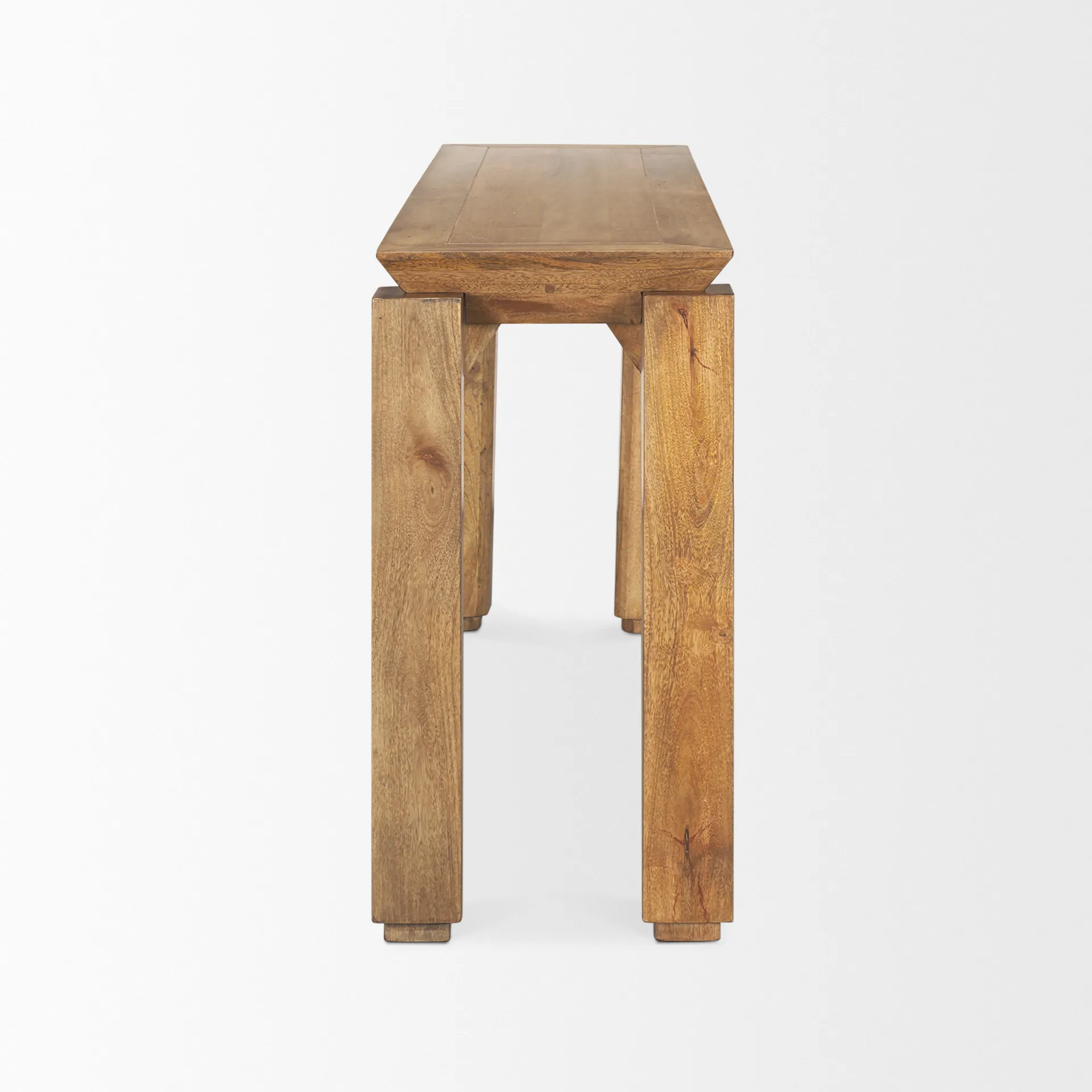 Sapphira Console Table is meticulously crafted from solid mango wood and treated with a delicate natural stain, showcasing its exquisite grain of the wood and highlights its elegant structural form. The elevated table top is thoughtfully designed, appearing to be floating above the supporting legs. Elevate spaces with the timeless elegance of the Sapphira Console Table, where meticulous craftsmanship meets innovative design for a statement piece that effortlessly combines style and functionality.