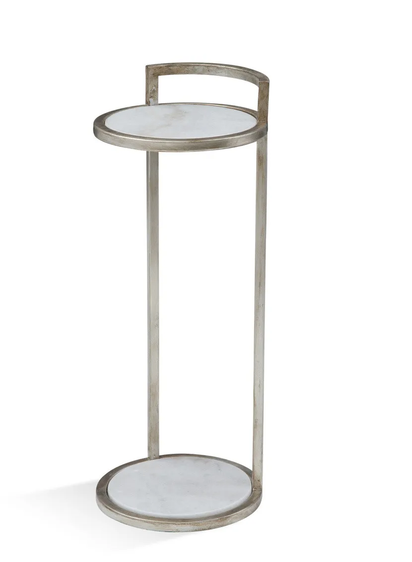 Metro modern styled martini table. White marble inserts with silver leaf frame. Classification: Companion: Materials: