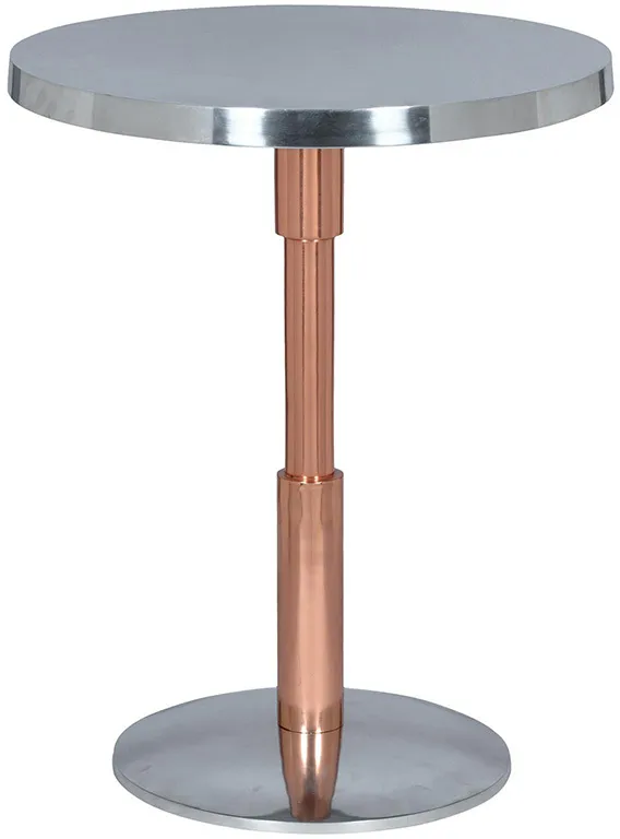 A clean design, the Kristof Accent features a shiny polished aluminum finish, with a copper-plated leg. Dimensions: 18.25 x 18.25 x 22.5" Artist: Jonathan Wilner