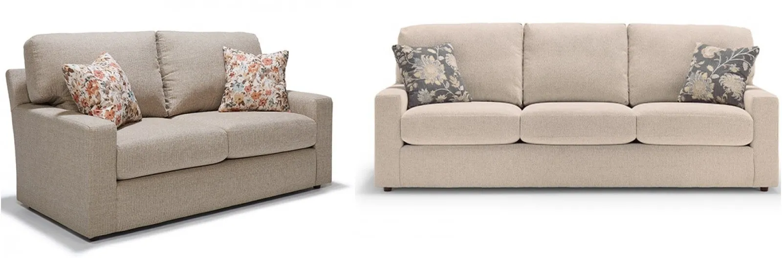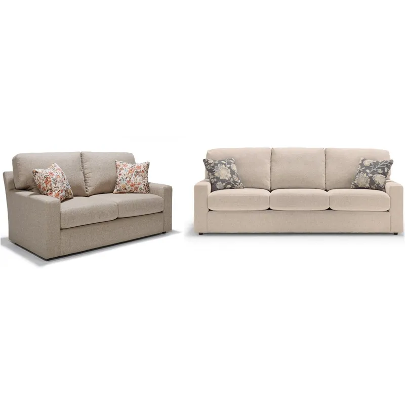 Dovely Loveseat (L25): The Dovely collection's transitional design makes it equally comfortable and stylish. The loose-back cushions are immensely filled with lush pillow fibers and feature bottom zippers for fiber adjustment. Reversible seat cushions utilize HR seat foam that's both soft, yet sturdy. Choose from over 700 fabric choices and two pillows in fabric choice. Made in the USA by fine craftsmen.