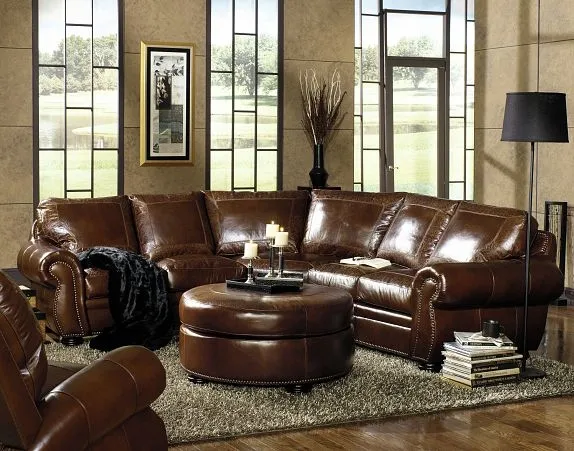 The 9455 three-piece sectional features a rolled arm with paisley embossing on the back pillows. Nailhead trim across the stump panel, back, and front rail completes the look.