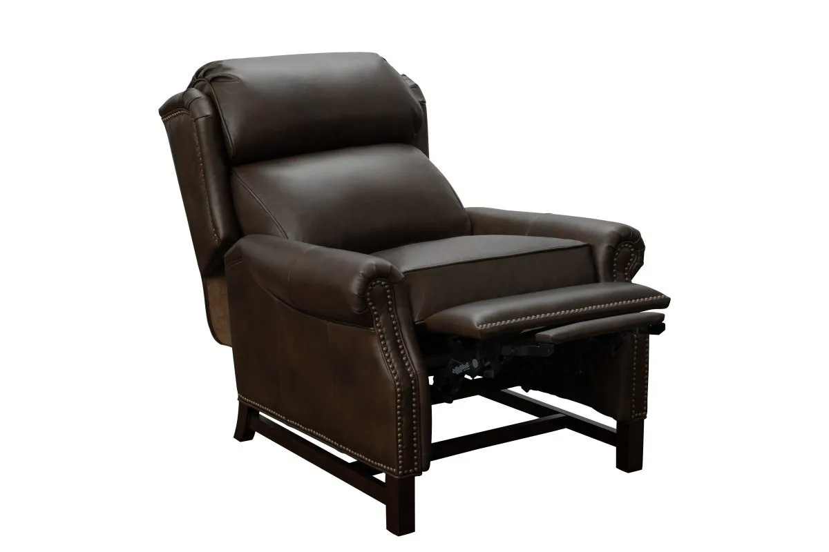 Classic wing back lounge chair recliner with 3-way push thru the arms mechanism and footrest extension. Shaped knee back rolled arms and pleated wings are accent with nail head trim. Adjustable semi-attached zippered pub back and welted boxed loose seat cushion with pocketed coils and down blend feather wrap provides unsurpassed seating comfort. Chippendale hand carved base is finished in a reddish-brown merlot finish.