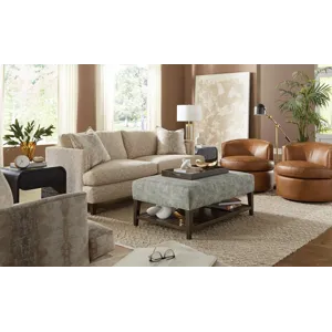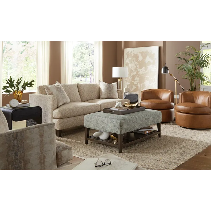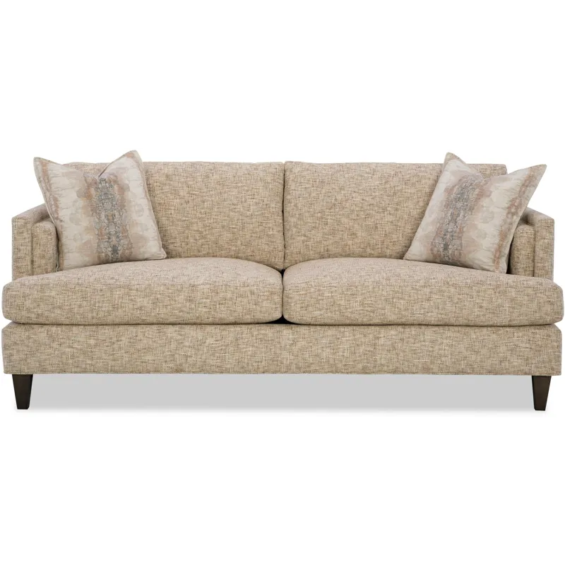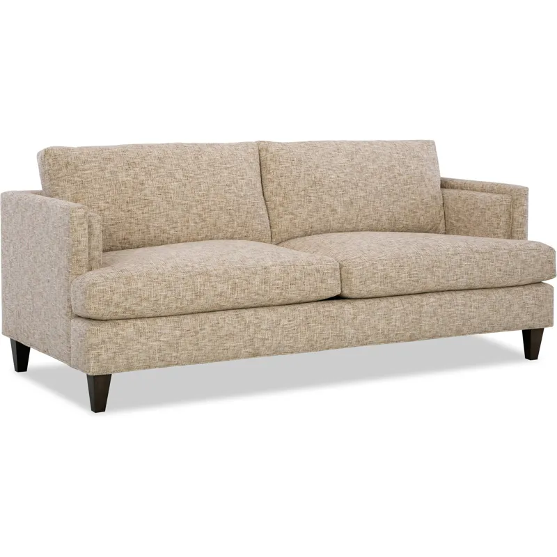 Modern and Casual, this sofa has great architectural lines combined with plush comfortable seating. It features unique inset track arms, tapered legs, and wide Blend Down seat cushions. French seamed overall. Loose box border backs. Standard with two flanged toss pillows. Also available are the matching chair 1/2, ottoman and sectional.