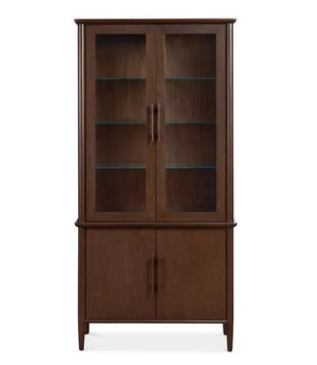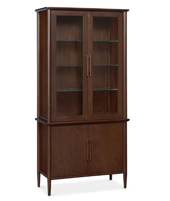 The Copenhagen Storage Cabinet offers mid-century modern elegance that allows you to both store and share with style. Rendered in espresso-finished American walnut veneer, the top portion of the glass hutch has two glass doors and three adjustable glass shelves. A touch switch controls three brightness settings. The attached storage base has two wood doors and one adjustable shelf. Like all the pieces in our contemporary Copenhagen Collection, the rounded trim details and solid beech wood handles bespeak an organic elegance rooted in Danish-inspired design.