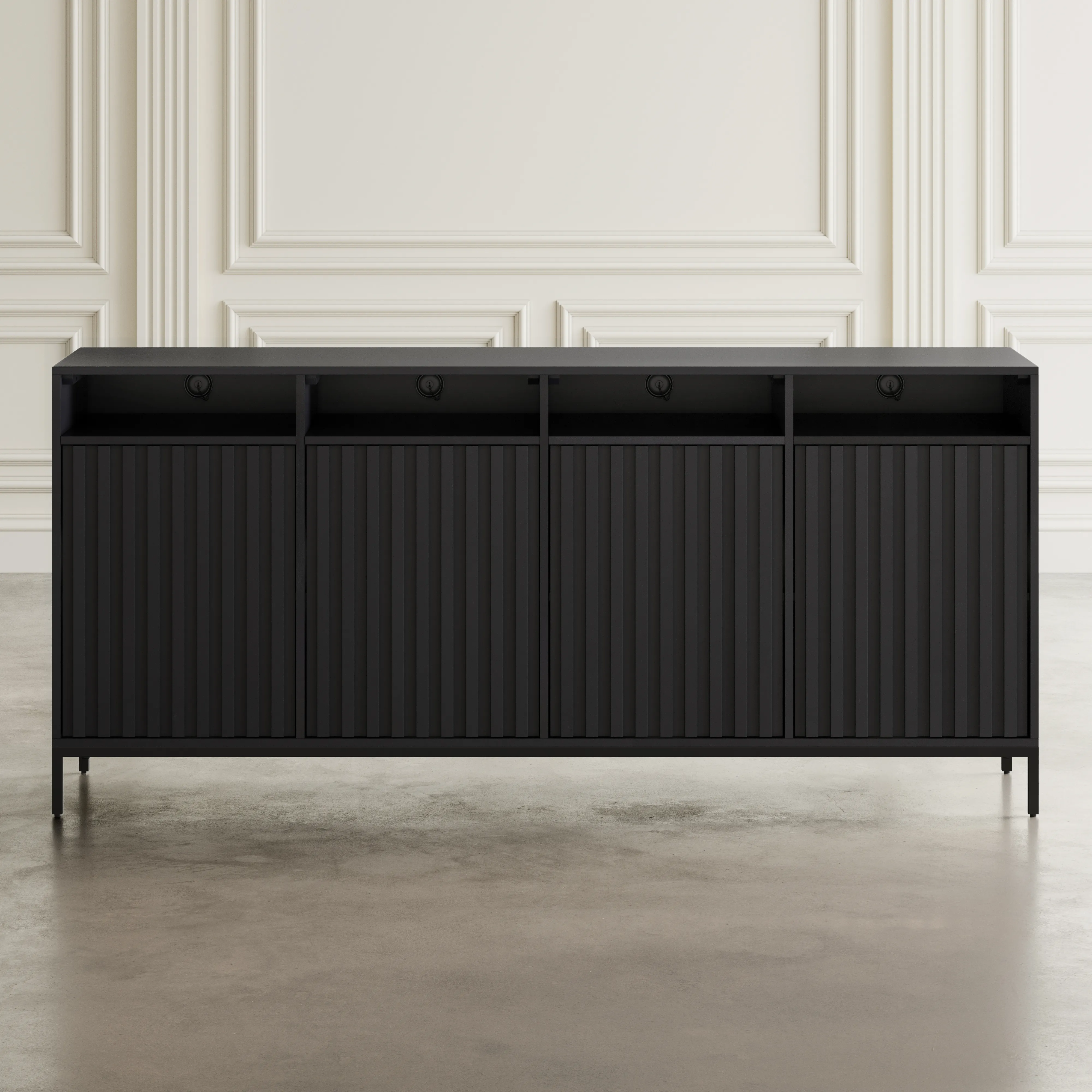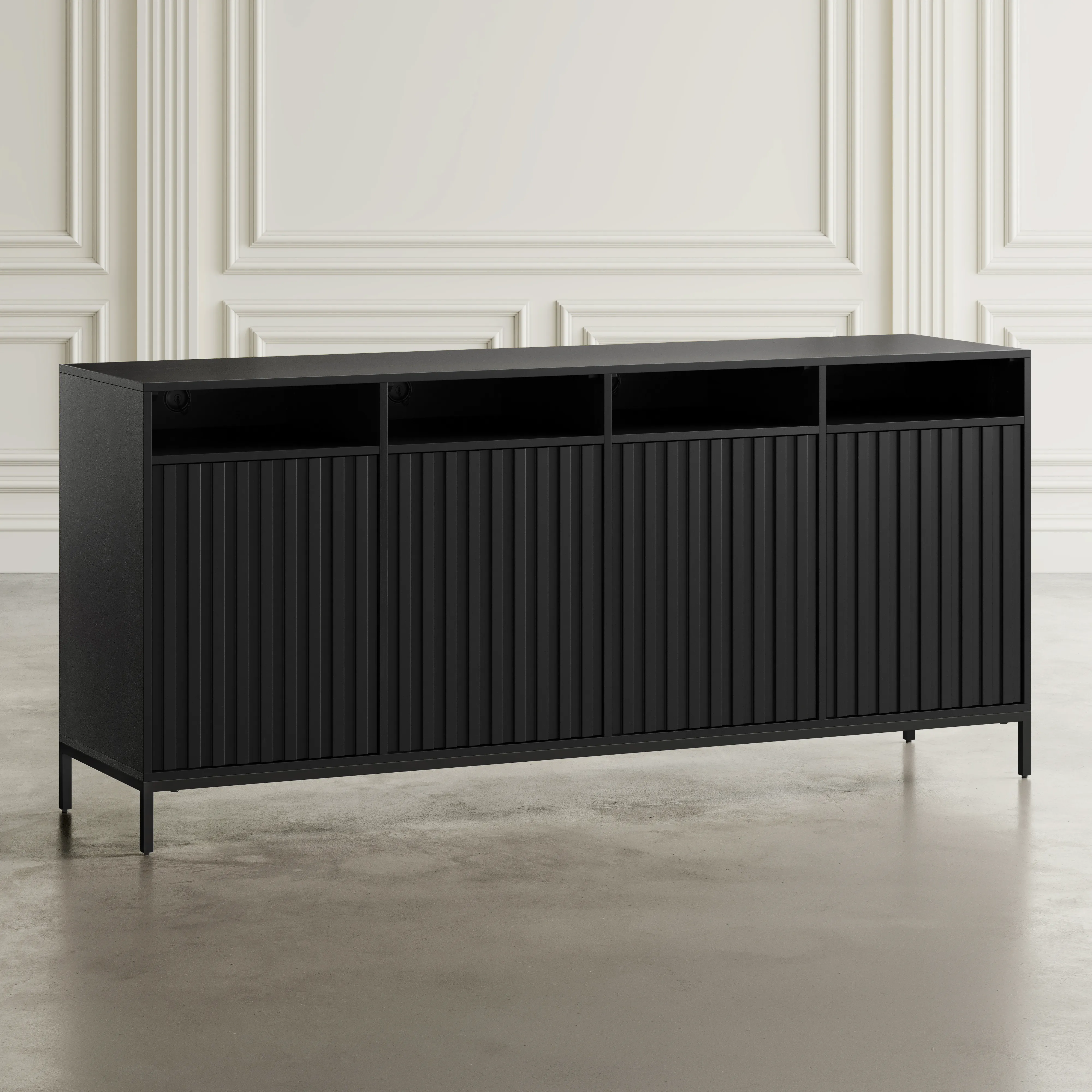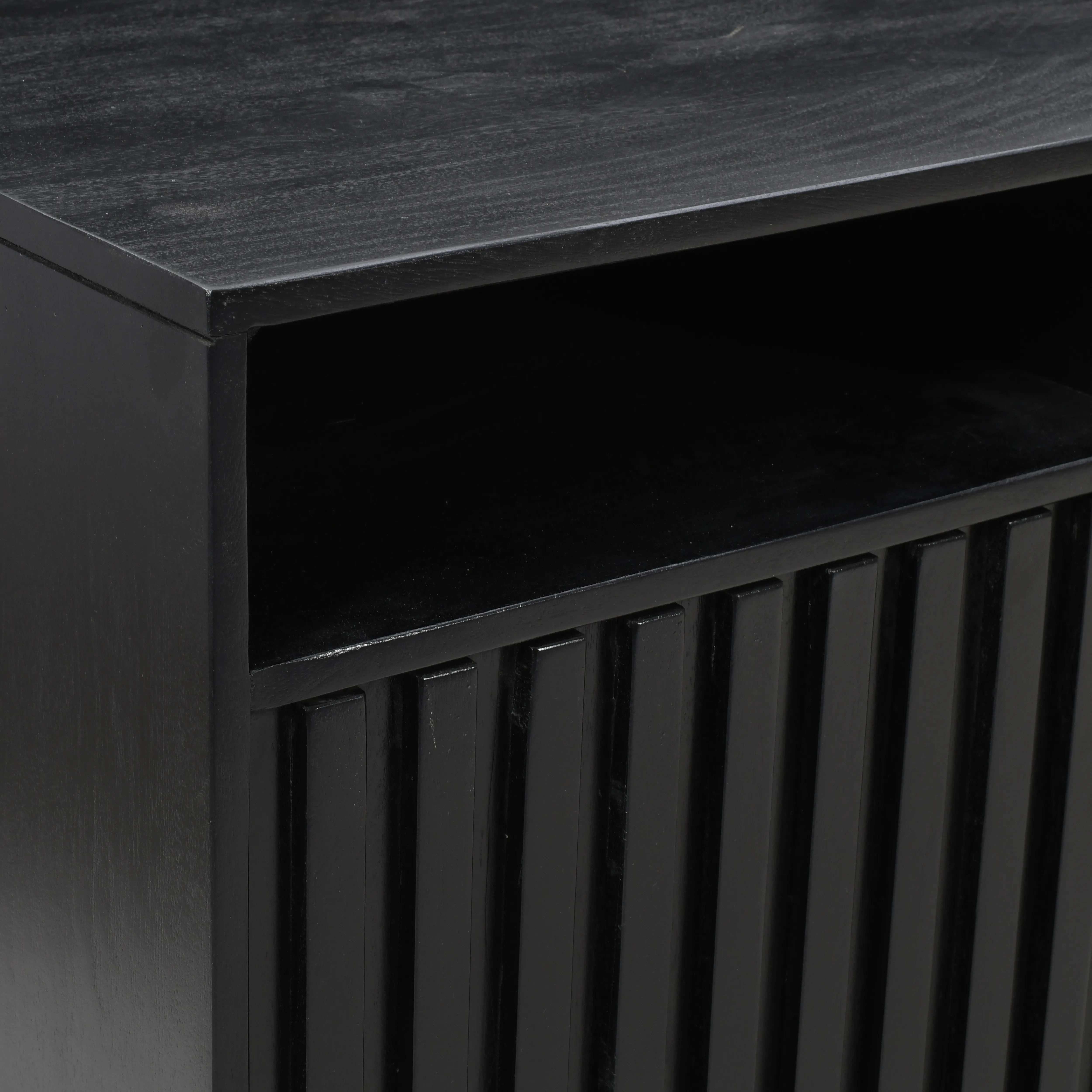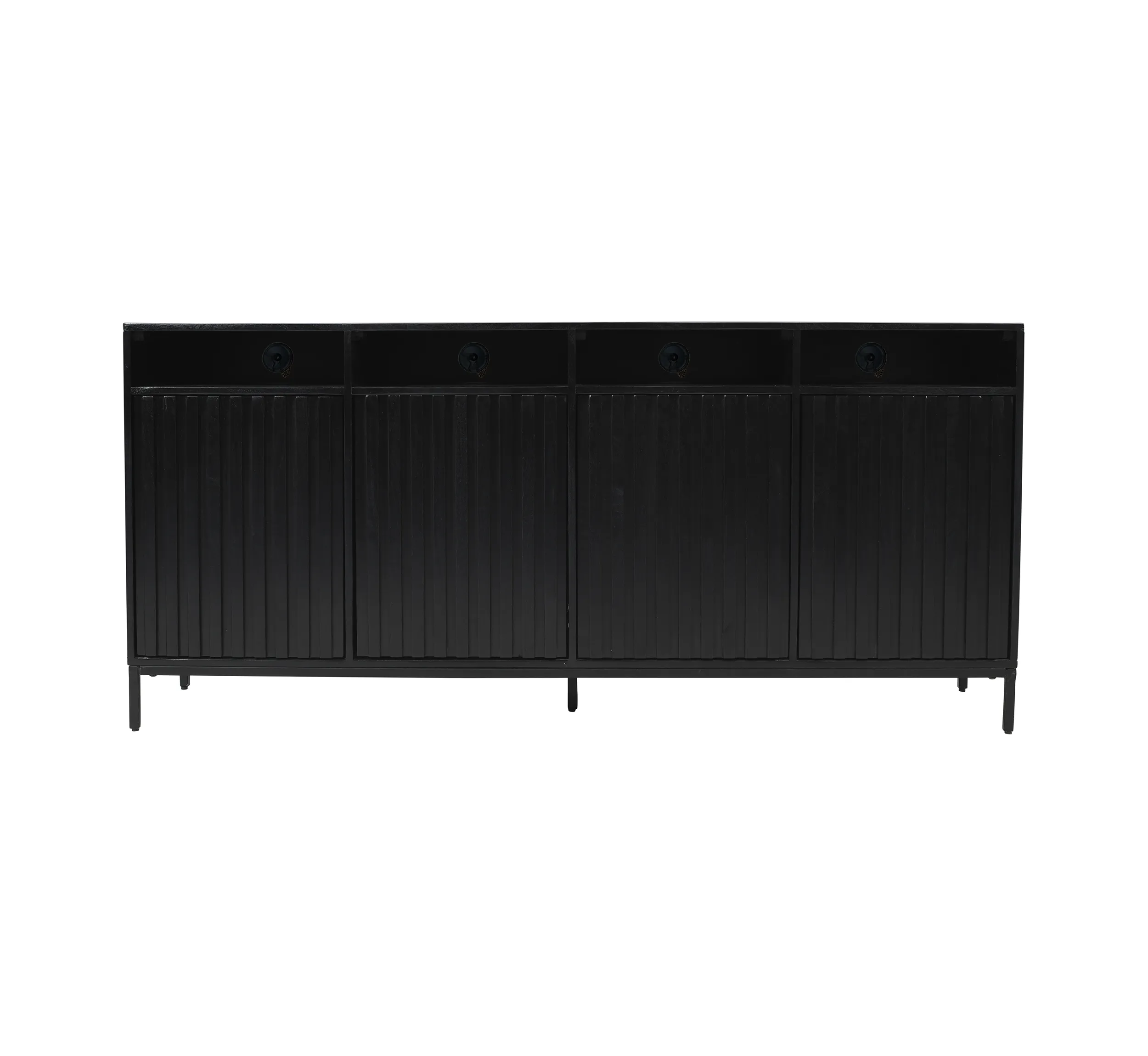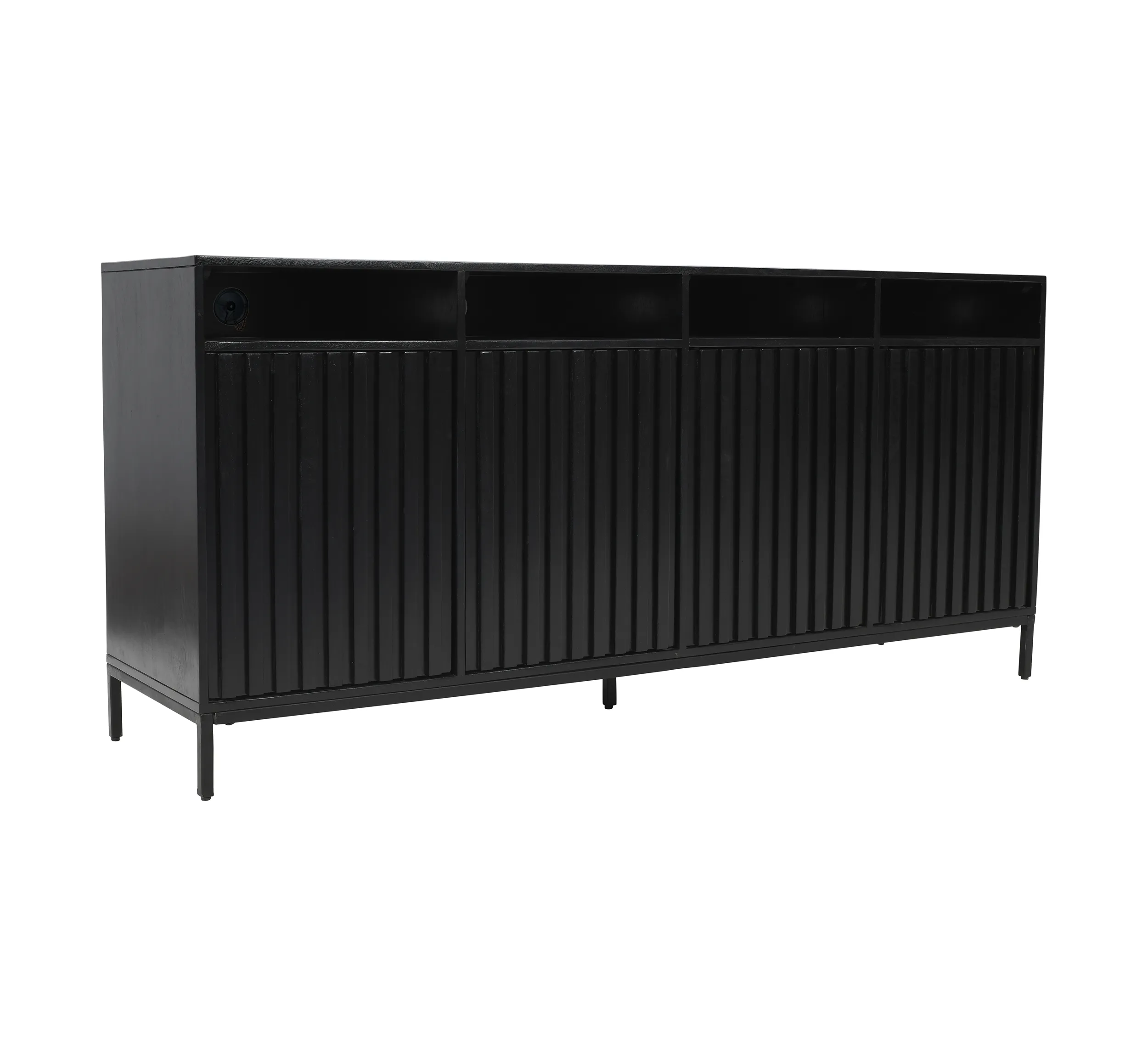 • -Solid Acacia Wood and Veneer Construction with Unique Fluted Door Design -European Door Hinges with Push to Release Latches -Four Open Storage Shelves on Top - Perfect For Electronics -Built-In Cable Management Cutouts - - -