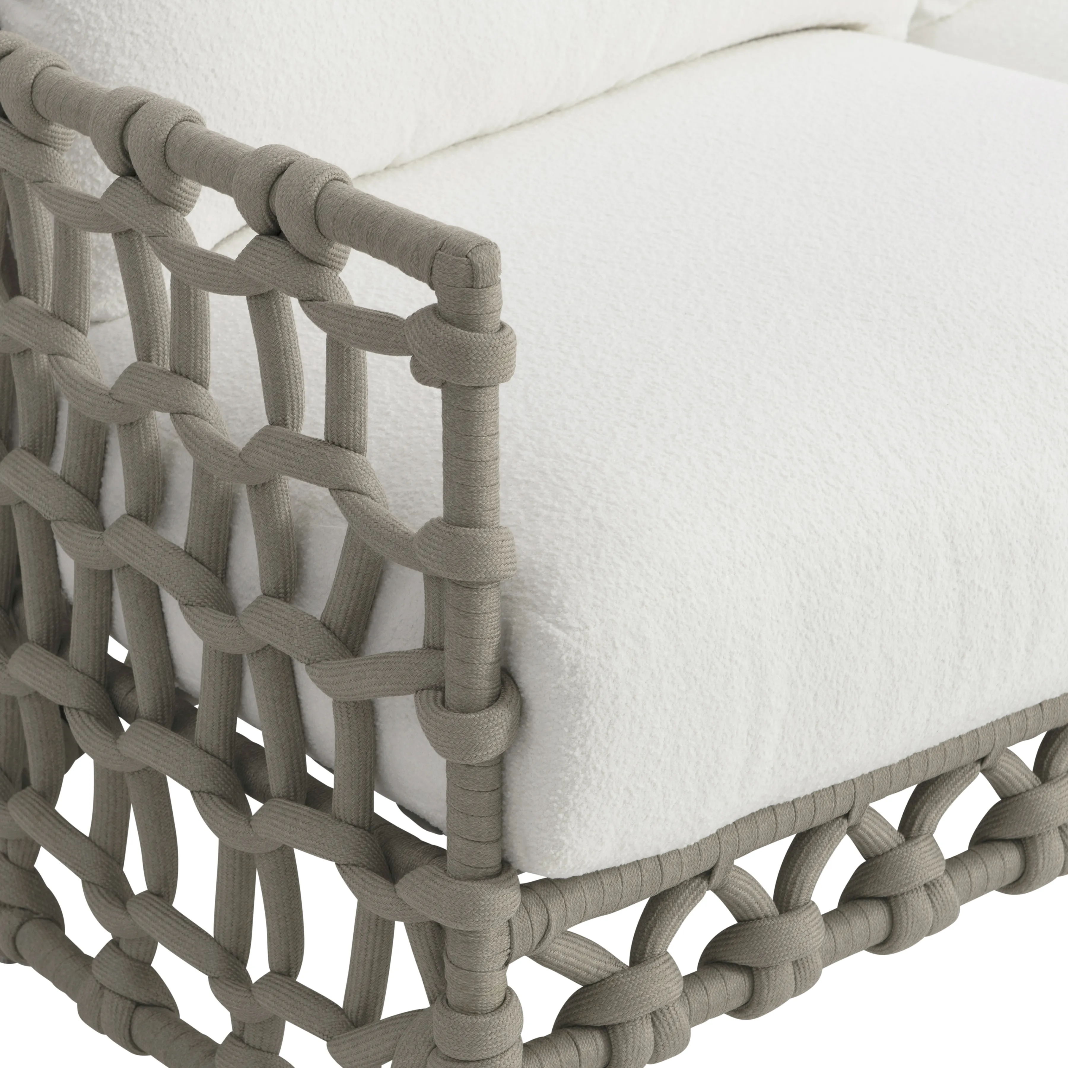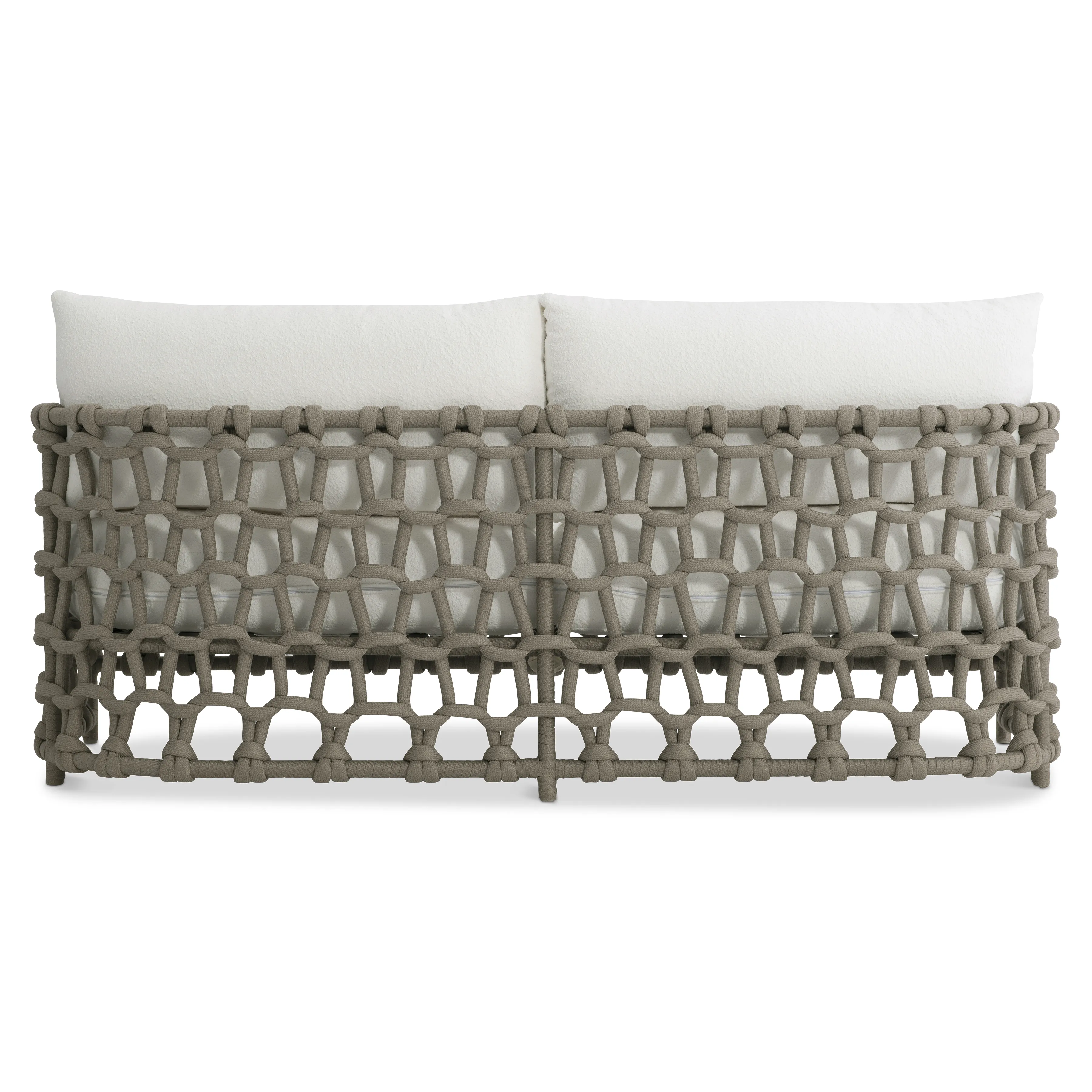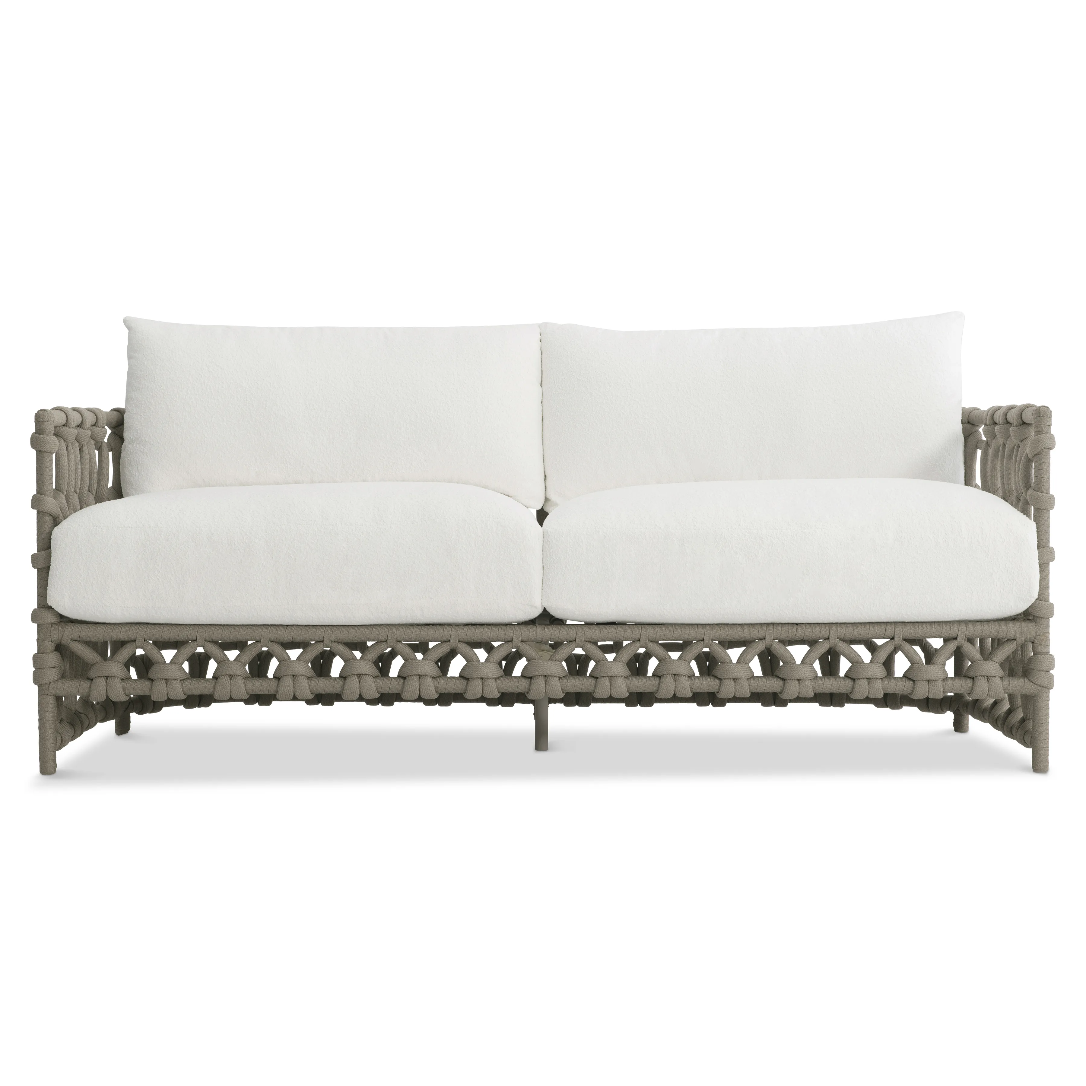 An open weave crafted of rope in a Shiitake finish twists a sophisticated pattern around the Nodi sofa. Comfort is key in this outdoor design with deep seat cushions and loose back pillows. The result is a sofa that is sophisticated enough for indoor settings, but created with materials to withstand outdoor elements.